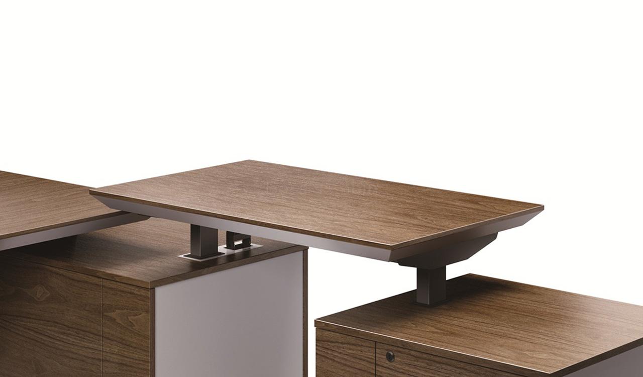 Main desk and side credenza with a smooth and silent motorized lift mechanism, from Linak of Denmark, to raise the height of the worktop up from 750 mm up to 1200. Its touch sensitive buttons can smoothly raise the side return to your preferred height. Includes a wire box for power and data connectivity.