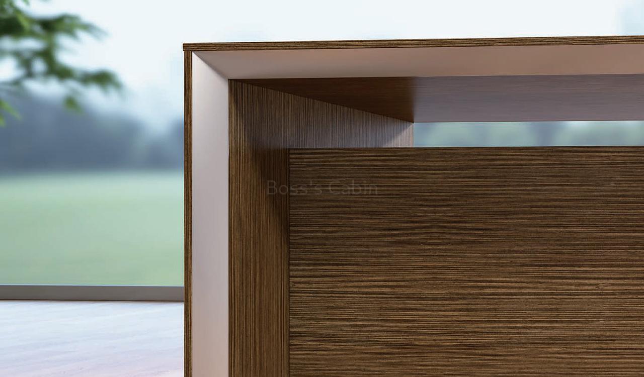 The Sirius Series 8 feet office desk is a contemporary masterpiece, featuring a side cabinet with a motorized height-adjustable top that rises up to 1105 mm for comfortable standing work. Finished in rich brown walnut veneer with sleek gray accents, it boasts a dual-tone top and chamfered bottom edges for a crisp, modern profile. The desk includes a full-length modesty panel and a multi-functional wirebox with power, data, and HDMI sockets. The side cabinet is fitted with premium Hettich slide rails, FGV damping hinges, and a secure BMB lock—blending style, functionality, and technology.