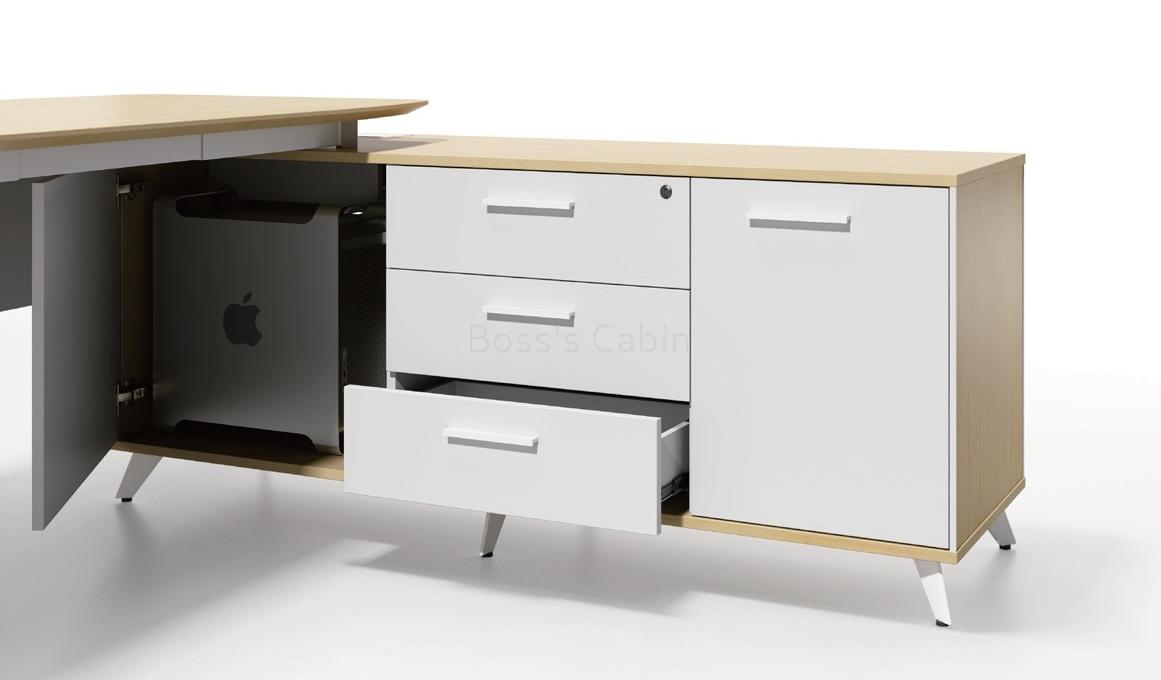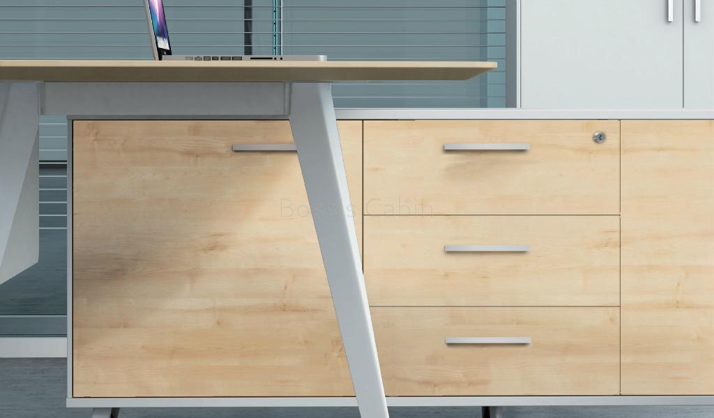 A sleek and stylishly built office desk in maple and white laminate combination. Its slim, tapered edged worktop has a 120 degree curvature for better user ergonomics and contemporary looks. Designed with angled steel legs it includes a modesty panel and a side cabinet with three drawers, storage space and one aluminum alloy wirebox for organizing your cables & wires. A perfect choice for a modern office.