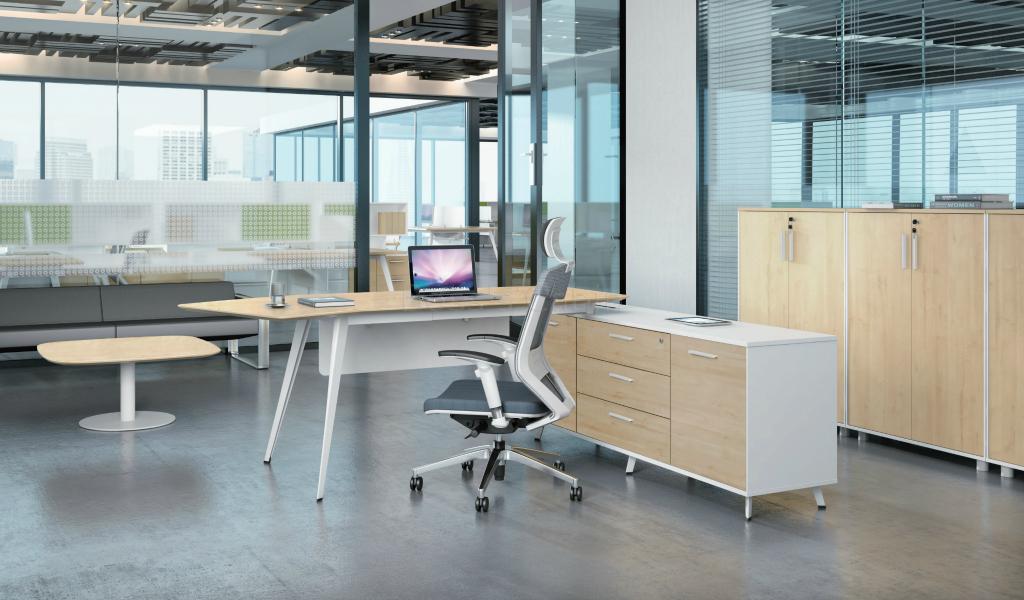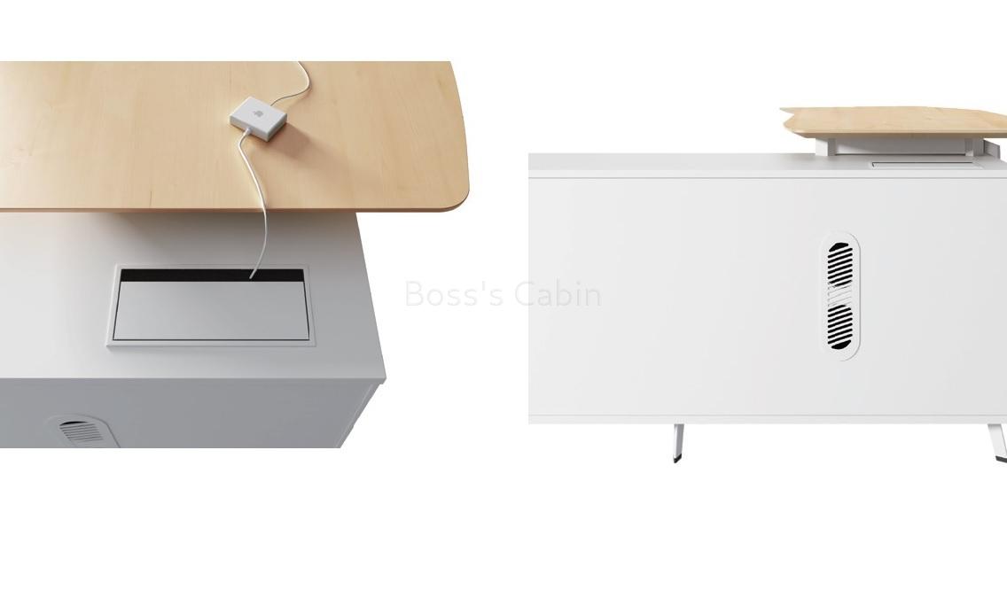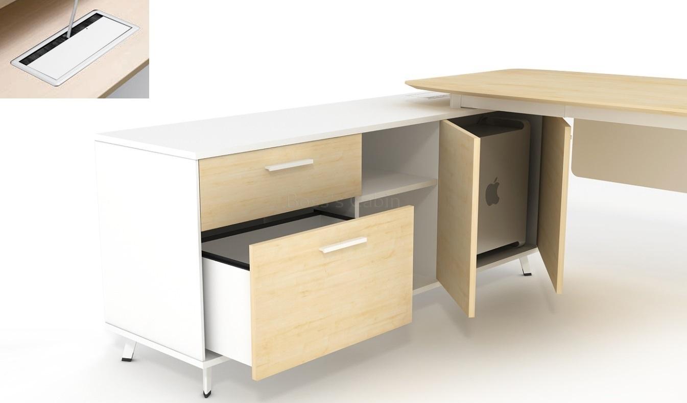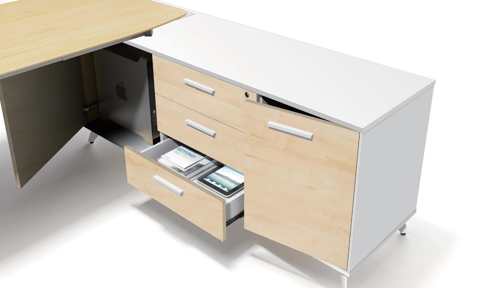 1. Maple laminate desktop with a 120 degree curvature on one side and thin tapered edges. 2. Side credenza with wirebox. 3. Tapered steel legs in white powder coated finish.