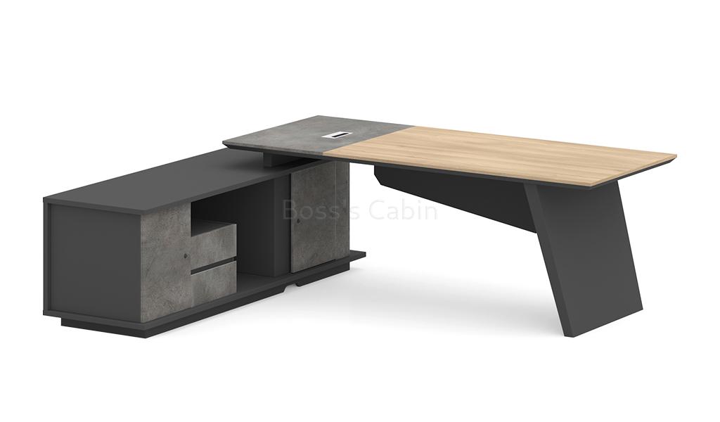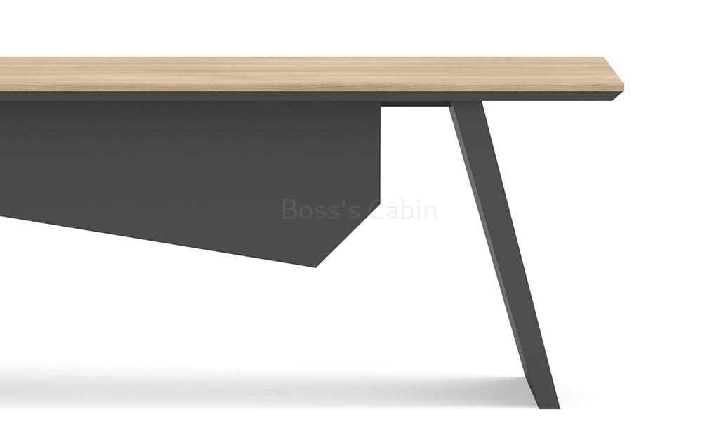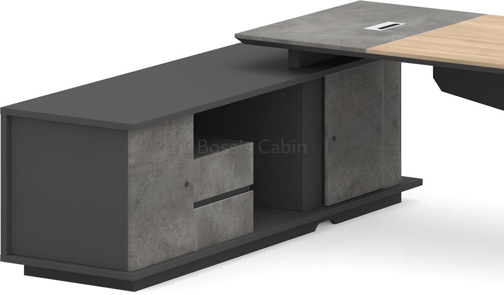 A stylish 6.5 feet width office table featuring a slanted leg design and a parametric-shaped modesty panel in a sophisticated blend of Akazie oak, rock grey, and carbon grey laminates. It includes a side cabinet with drawers, open shelves, and dedicated CPU storage. An aluminum alloy flip-open wirebox with an integrated cable management system is built into the desktop. Designed for versatility, it pairs seamlessly with all products of the Spiro series.