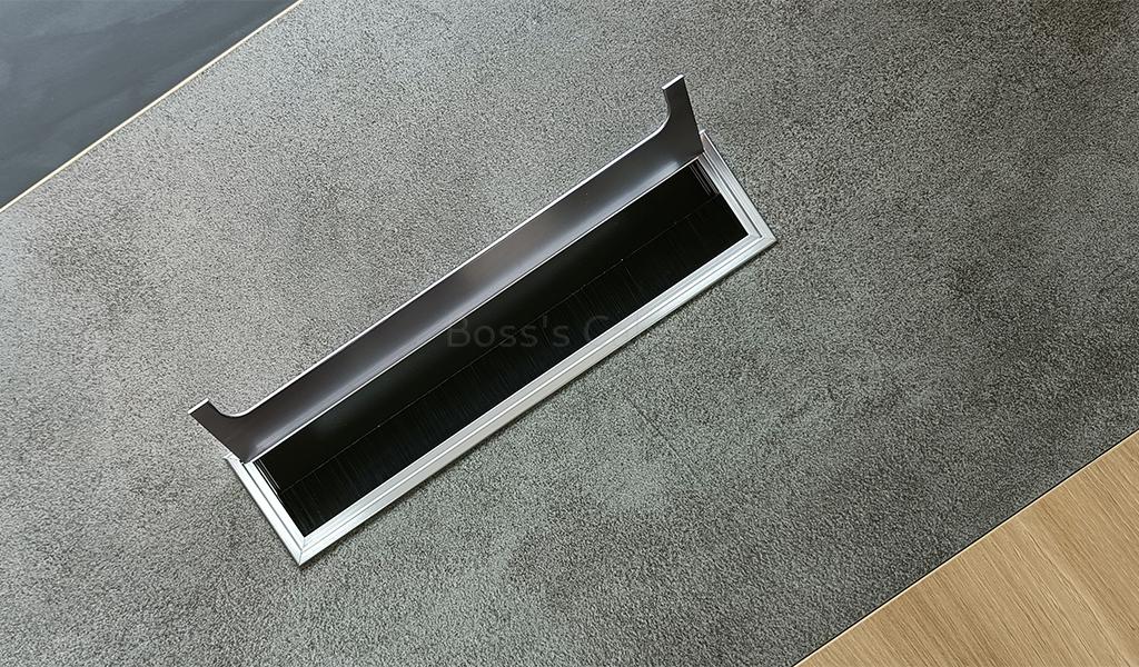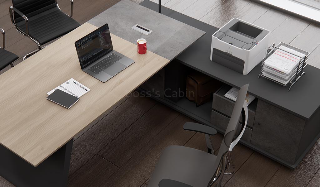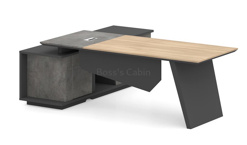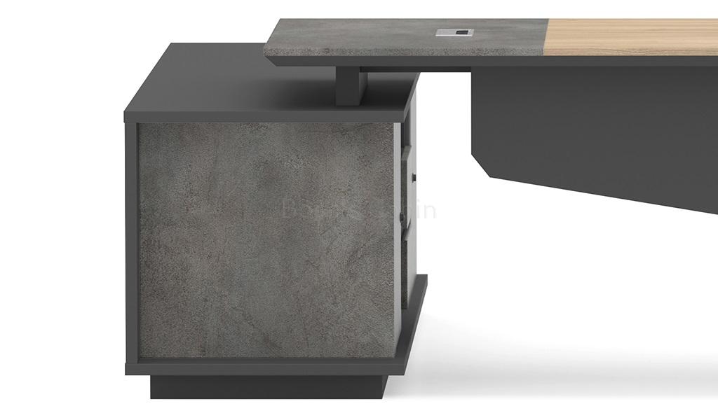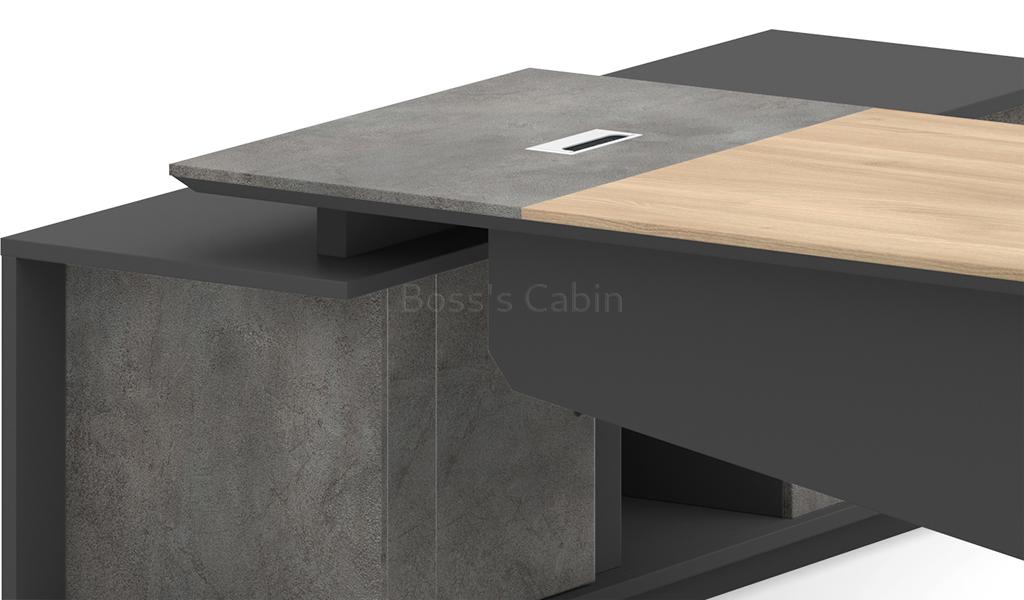 A stylish 7 feet width office table featuring a slanted leg design and a parametric-shaped modesty panel in a sophisticated blend of Akazie oak, rock grey, and carbon grey laminates. It includes a side cabinet with drawers, open shelves, and dedicated CPU storage. An aluminum alloy flip-open wirebox with an integrated cable management system is built into the desktop. Designed for versatility, it pairs seamlessly with all products of the Spiro series.