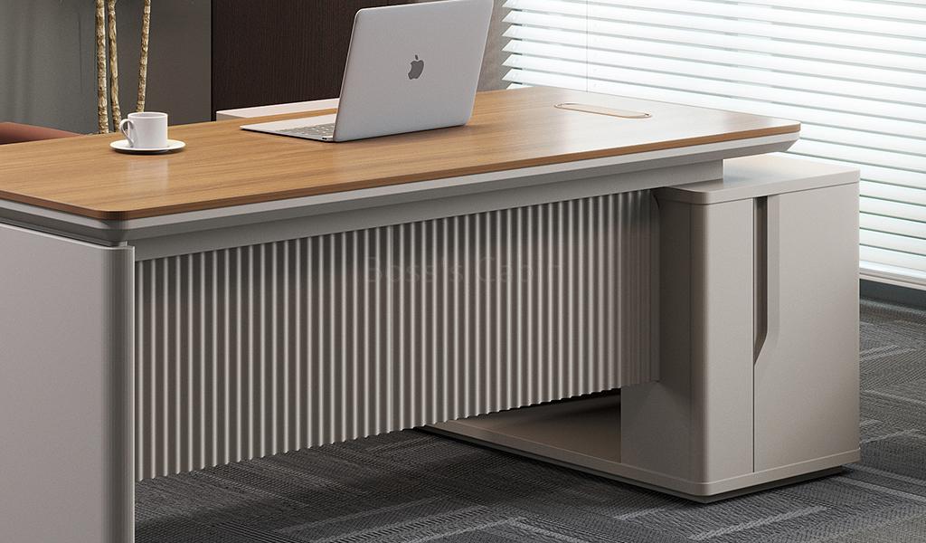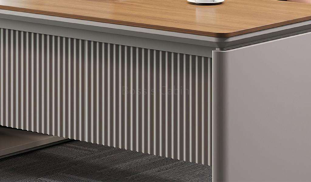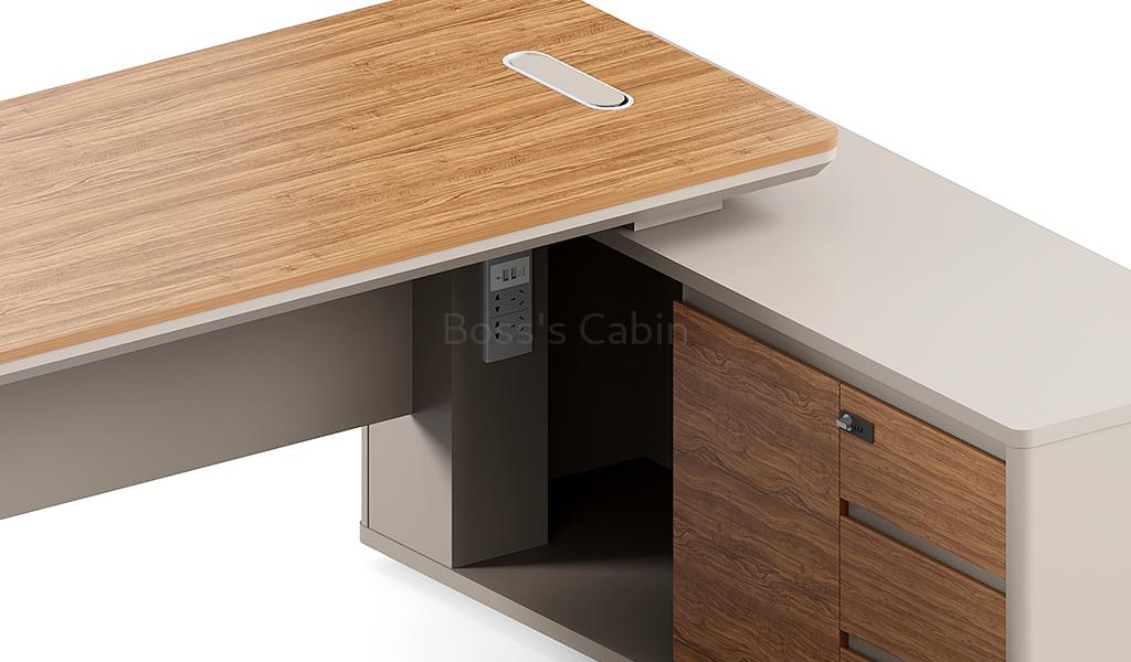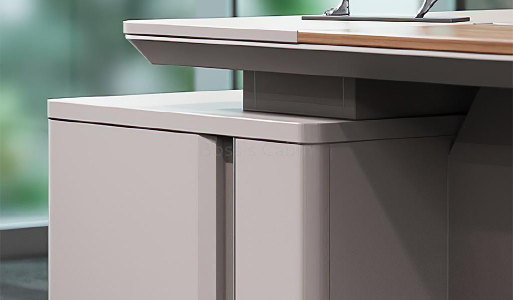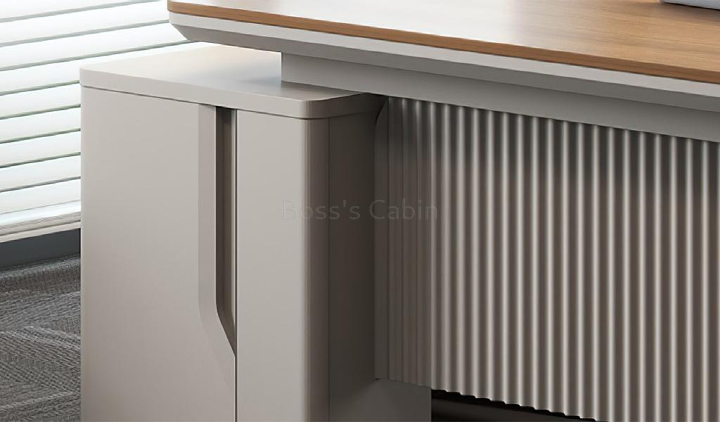 A medium-sized office table in rich sandalwood and seagull gray laminate, featuring a dual-tone top with chamfered edges and rounded corners. Includes a side cabinet with number-lock drawers, shelves, and CPU space. A fluted modesty panel adds style, while an inbuilt wire grommet and concealed power sockets ensure easy connectivity. Part of the Swan series its ideal for cabins of 150 sq. ft. and above.