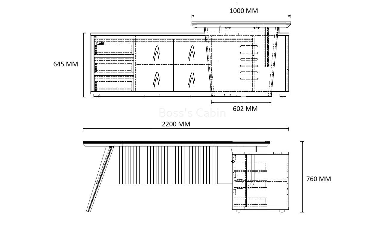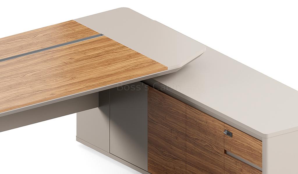 Office desk in 7 feet width with storage cabinet made with environment grade engineered wood and sandalwood laminate. The E1 grade MDF is a highly durable material and a world standard for premium office furniture while the sandal wood laminate is from our carefully selected range of premium laminates with consistent color and grain structure.
