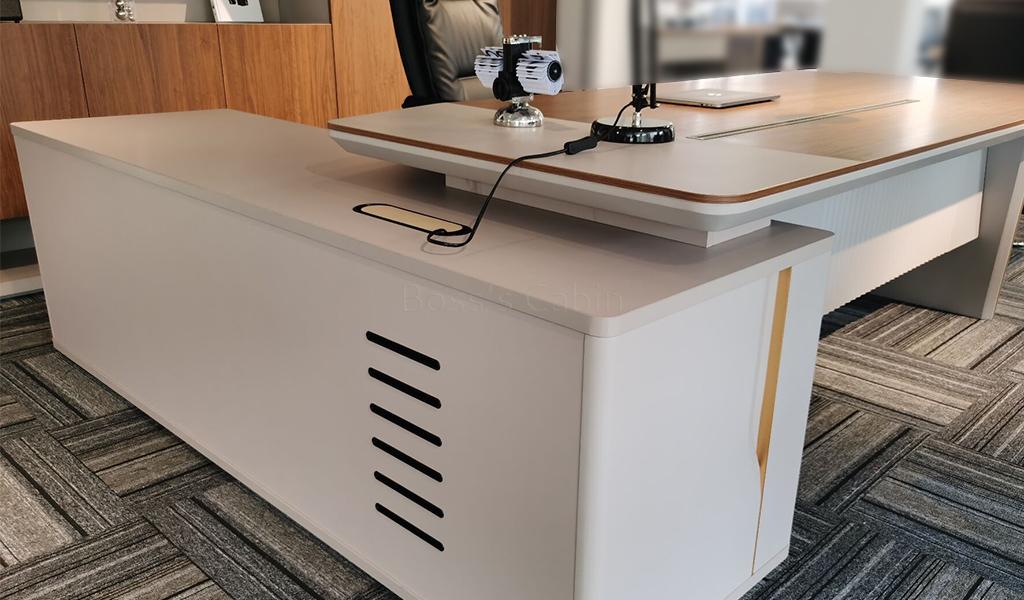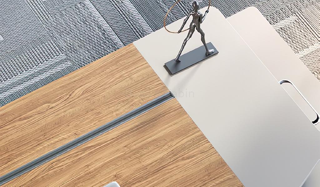 A medium size office table in rich sandalwood and seagull gray laminate, featuring a dual-tone beveled top with smooth, rounded corners. Includes a rounded edge side cabinet with number-lock drawers, shelves, CPU space. A fluted modesty panel and slanted leg add a touch of style. The integrated wire track with routing holes ensure clean cable management. Part of the Swan series, it is ideal for cabins of 200 sq. ft. and above.