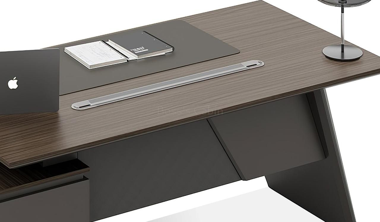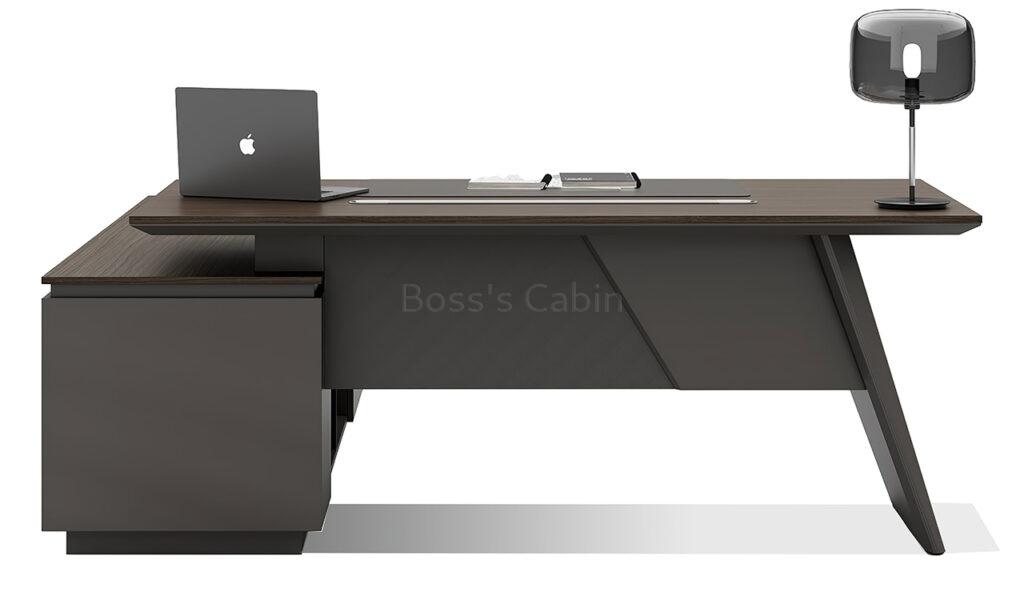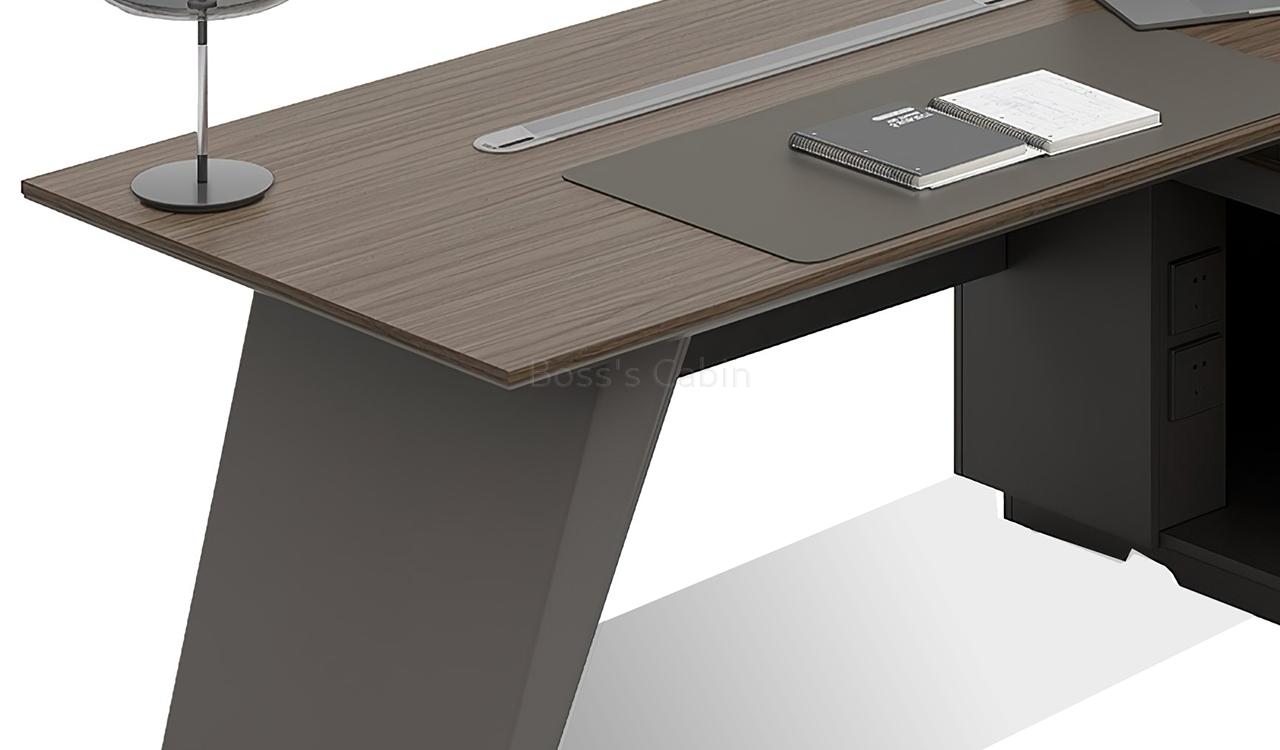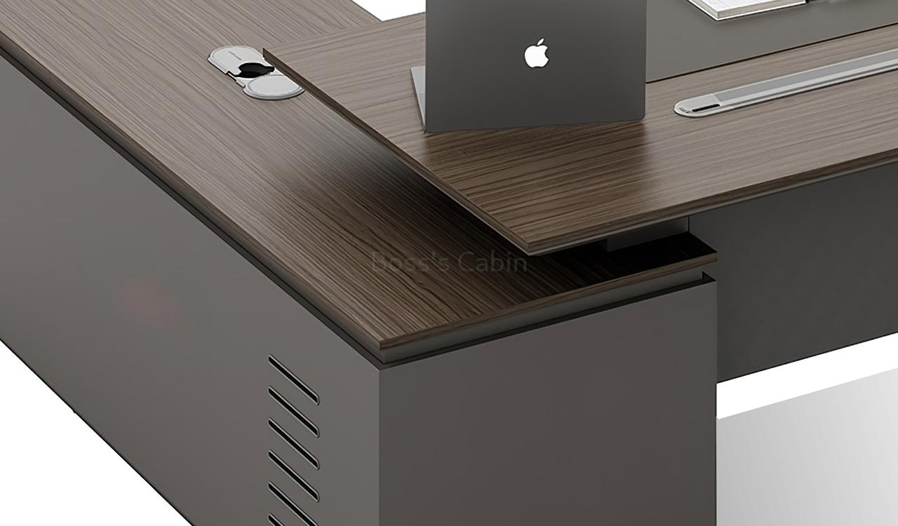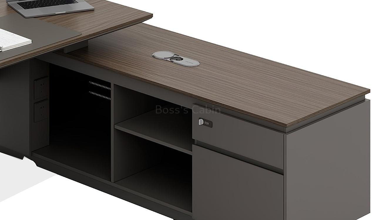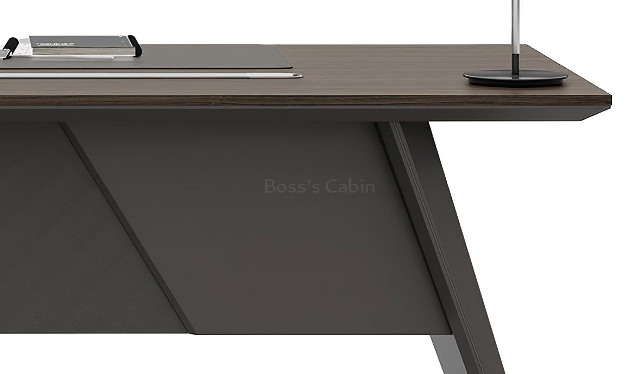 This executive L-shaped desk blends architectural form with premium functionality. Its angled panel legs and asymmetrical privacy panel create a striking silhouette, while the dual-tone tabletop with chamfered edges adds a touch of sophistication. Designed with side cabinet with number lock drawers, inbuilt wire-management grommets and power sockets under the top it pairs seamlessly with all Vistra series products.
