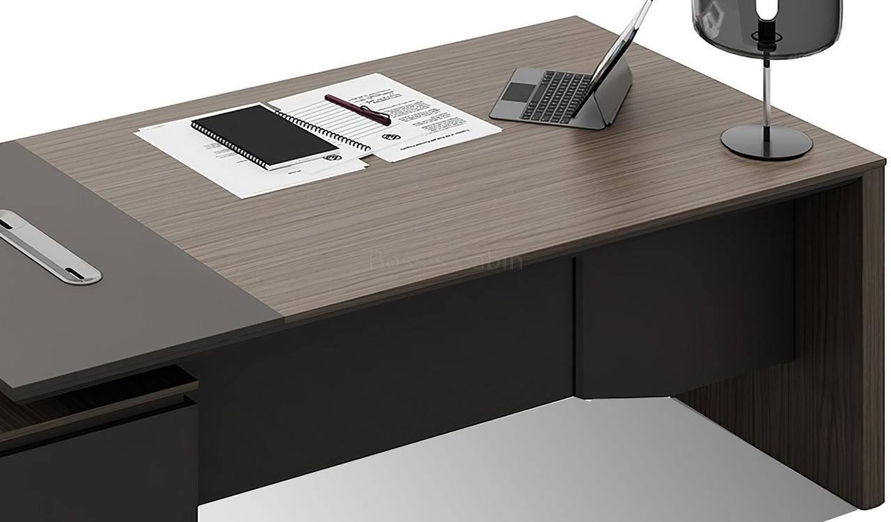 This modern 8 feet office desk is defined by clean geometric lines and a refined dual-tone finish in Asti Walnut and Advanced Gray laminate. The tabletop features inward chamfered edges and an integrated wire-routing grommet, blending sleek aesthetics with functionality. A side cabinet provides secure, number-lock storage and a built-in wirebox for seamless cable management. The front modesty panel, crafted in textured and solid gray tones, adds visual depth. Designed to pair effortlessly with all Vistra series products.
