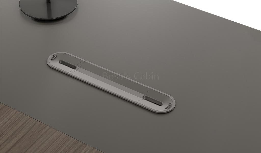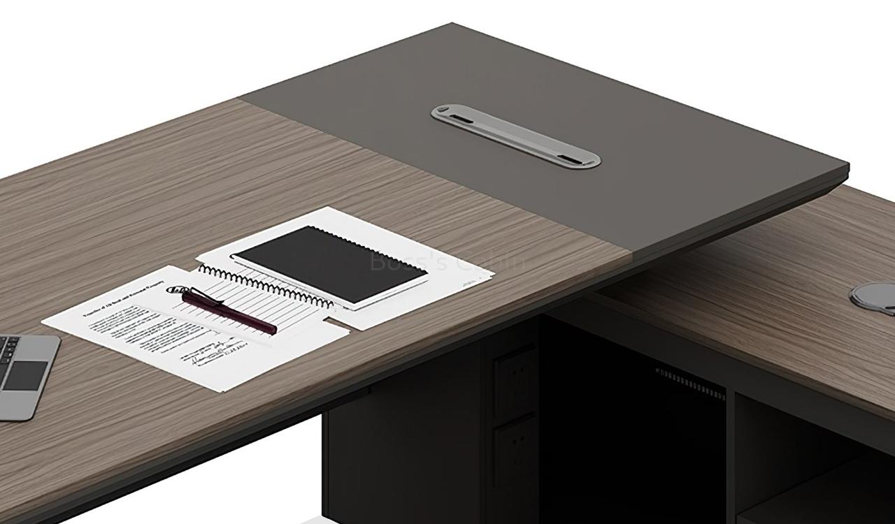 1. Tabletop in Asti Walnut and Advanced Gray laminate. 2. Side cabinet with inbuilt wirebox and number lock. 3. Tabletop with integrated wire routing grommet.