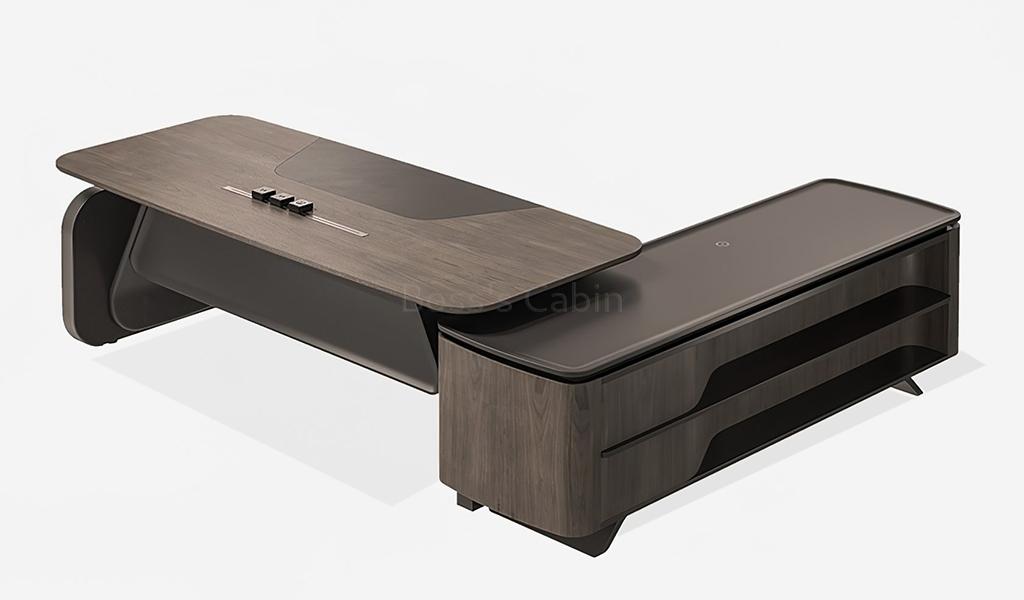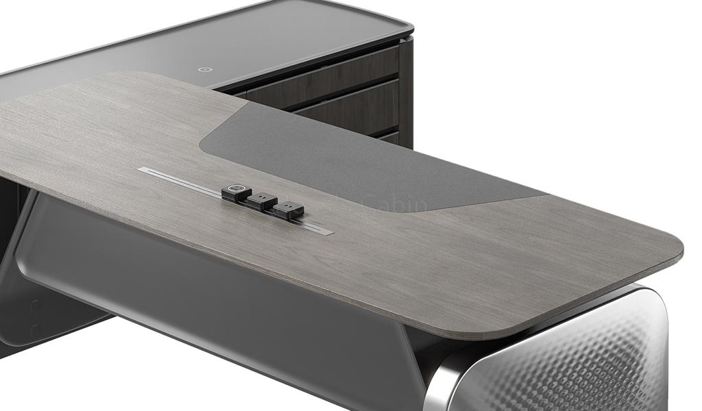 Convenience Features & Fine Craftmanship – Various parts of the desk separately undergo multiple processes to achieve a finely detailed finish – Chamfered edges, dual tone design in a combination of meteor gray lacquer and walnut veneer, VFF polished, hammered aluminum alloy leg, pull out drawer with personal effect organizer, embedded power track on desktop with movable power sockets are some of the minute details that you can notice.