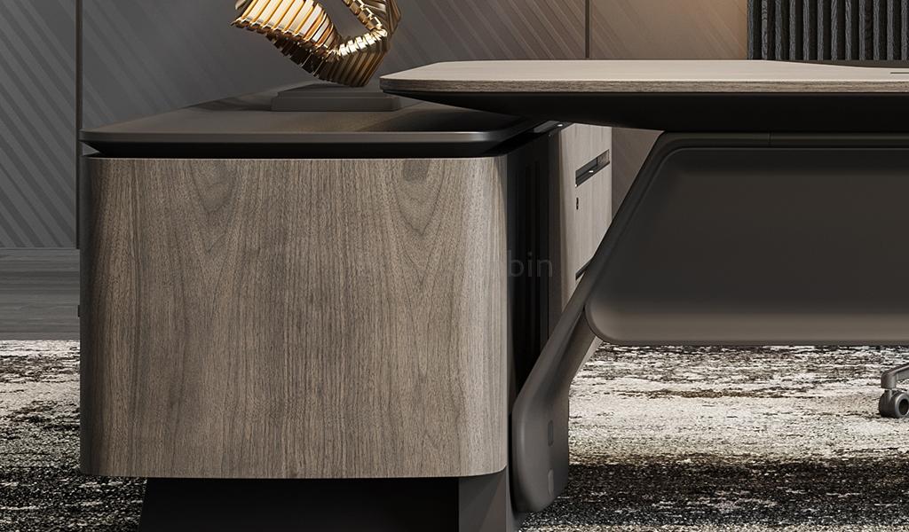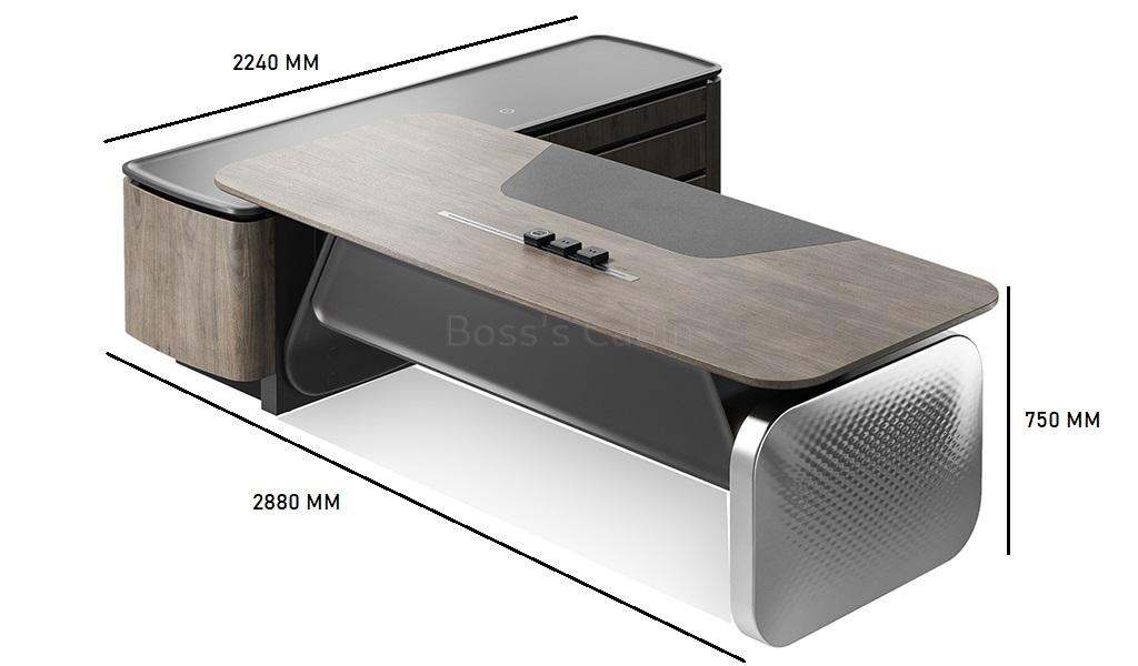 The 9.5 feet office desk from our flagship Atlas Series, is an embodiment of intelligent parametric design, luxurious finish, and precision engineering. Crafted from rich Black American Walnut veneer, meteor gray lacquer, and architectural-grade aluminum alloy, it seamlessly blends form and function. Featuring a gesture-controlled height adjustment mechanism, integrated multi-port power track, wireless mobile charging station, and a fingerprint lock, this desk with a custom designed lifting mechanism, delivers cutting-edge technology in a stunning, modern silhouette—the ultimate choice for a plush, contemporary office. View live video.