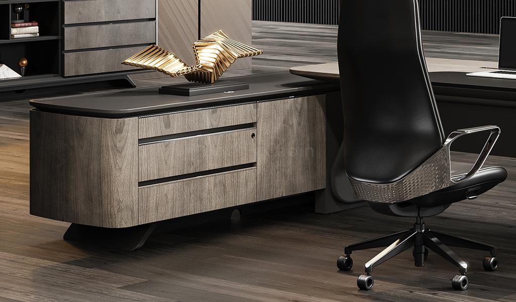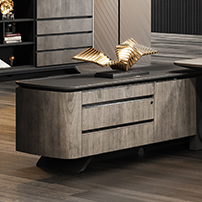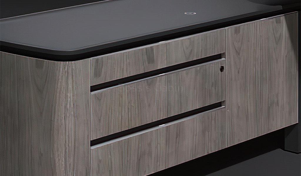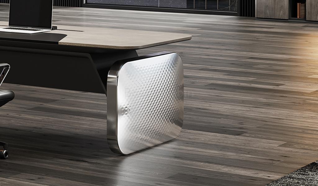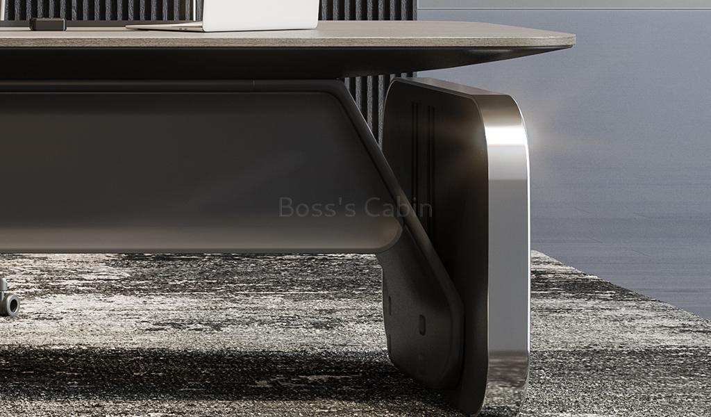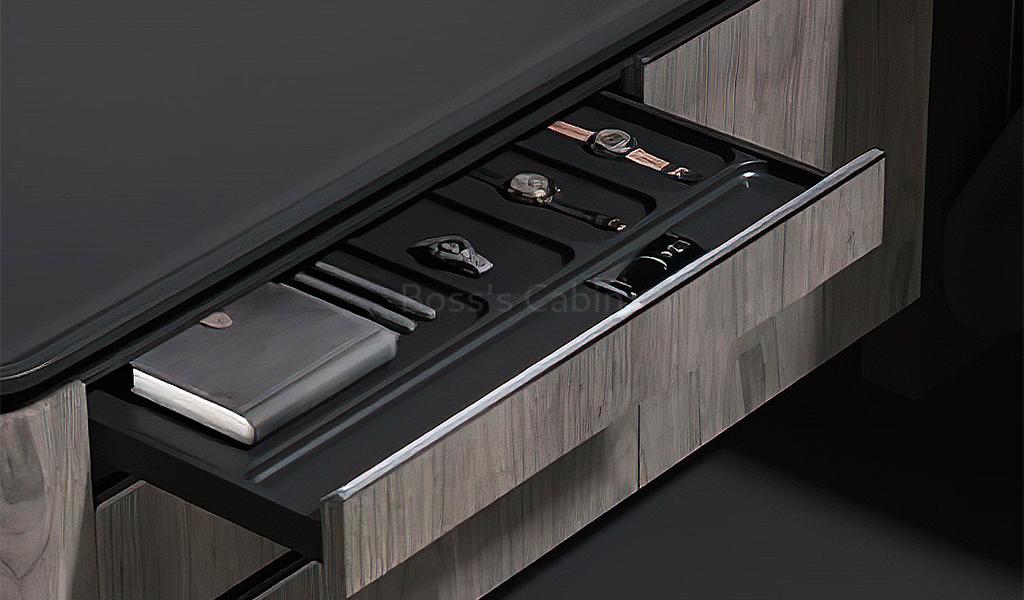 Convenience Features & Fine Craftmanship – Various parts of the desk separately undergo multiple processes to achieve a finely detailed finish – Chamfered edges, dual tone design in a combination of meteor gray lacquer and walnut veneer, VFF polished, hammered aluminum alloy leg, pull out drawer with personal effect organizer, embedded power track on desktop with movable power sockets are some of the minute details that you can notice.