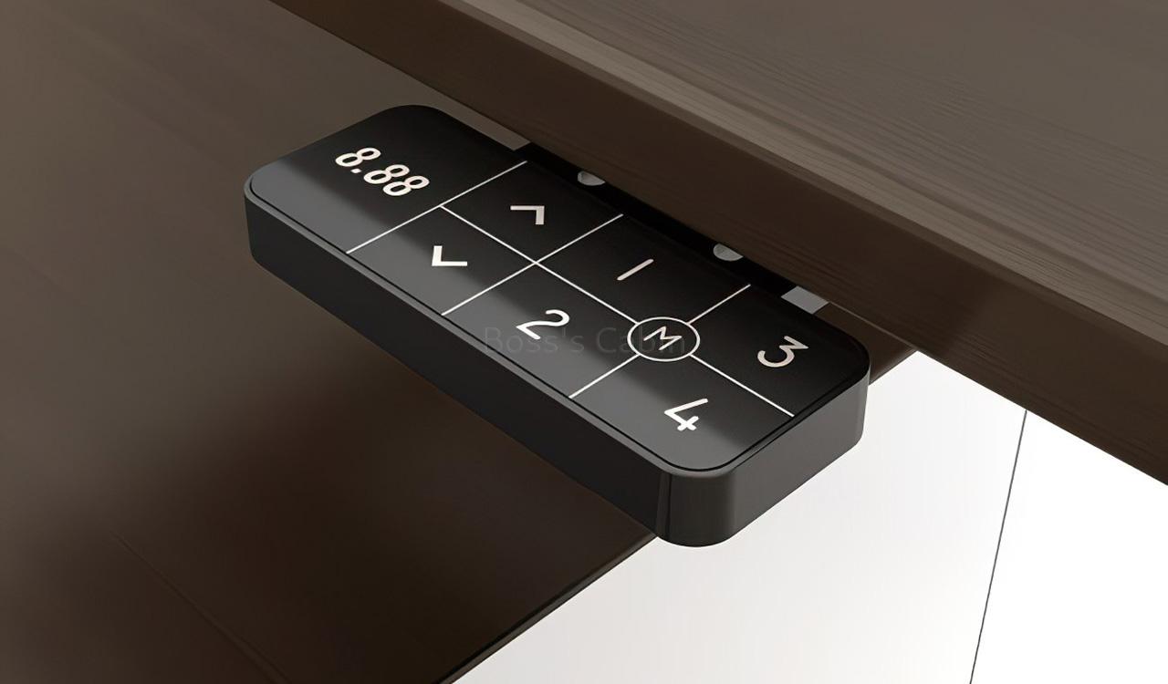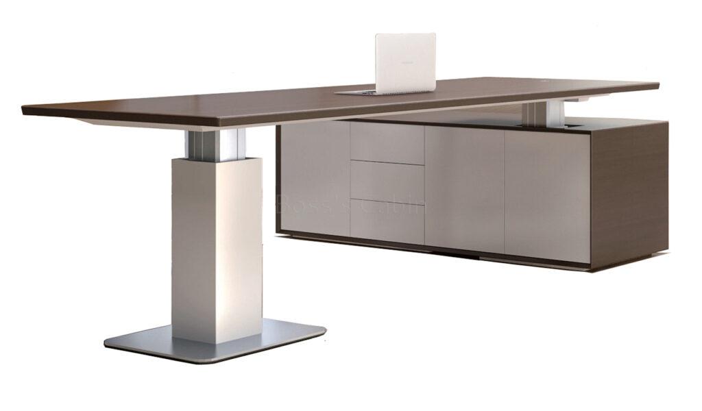 This 7.5 feet office desk with motorized lift combines cutting edge innovation with modern aesthetics. Designed to silently move up and down at the touch of button it allows you the freedom to stand and work. Finished in premium dark walnut veneer and lacquer. Includes side cabinet, concealed wirebox with power and data ports, wireless mobile charger embedded on desktop, Hettich damping slide, FGV damping hinges and Linak aluminum alloy motorized height adjustment mechanism. A perfect choice for a modern office.