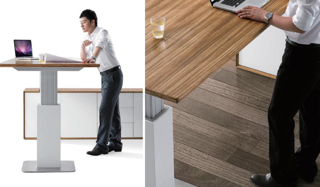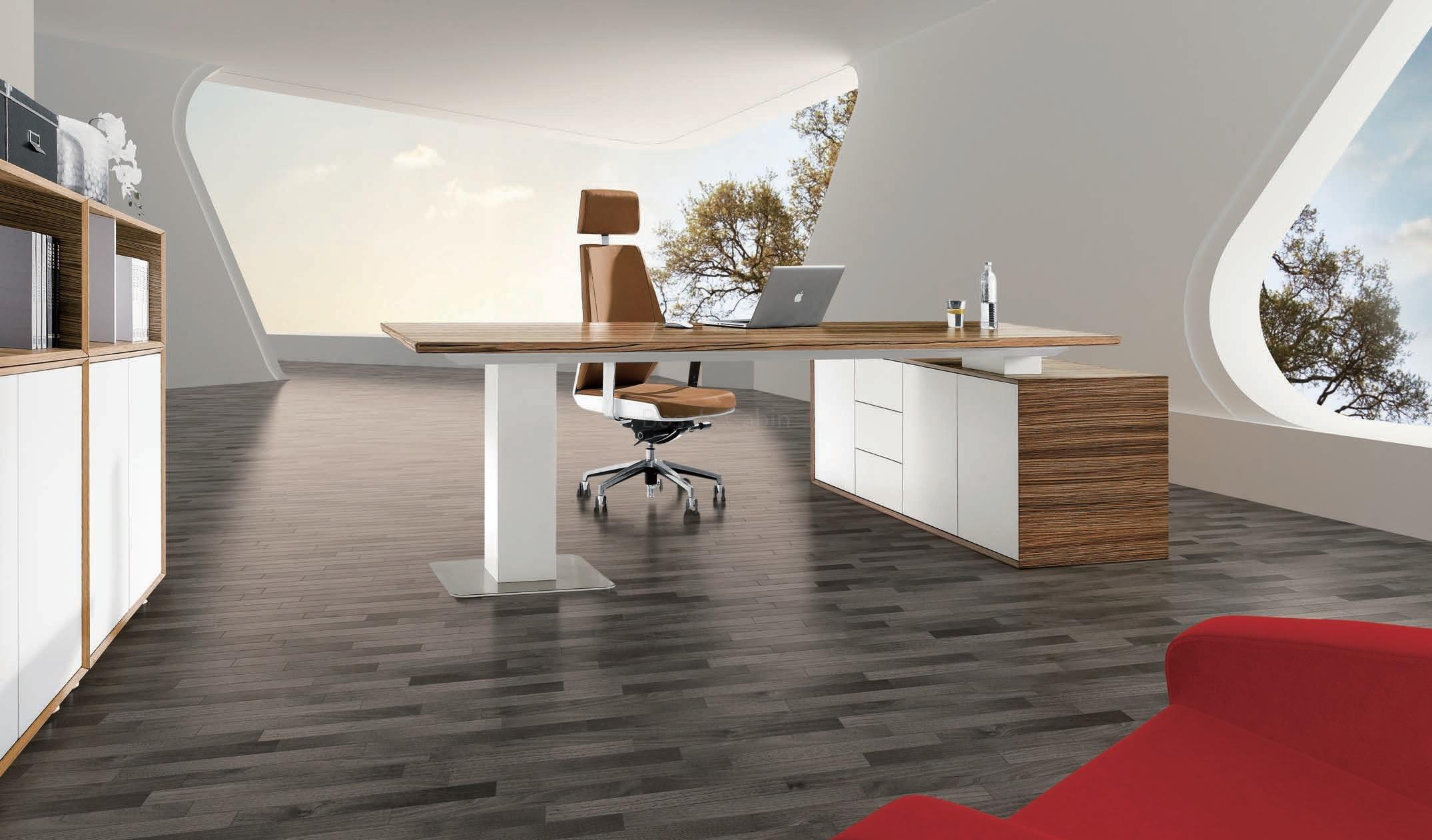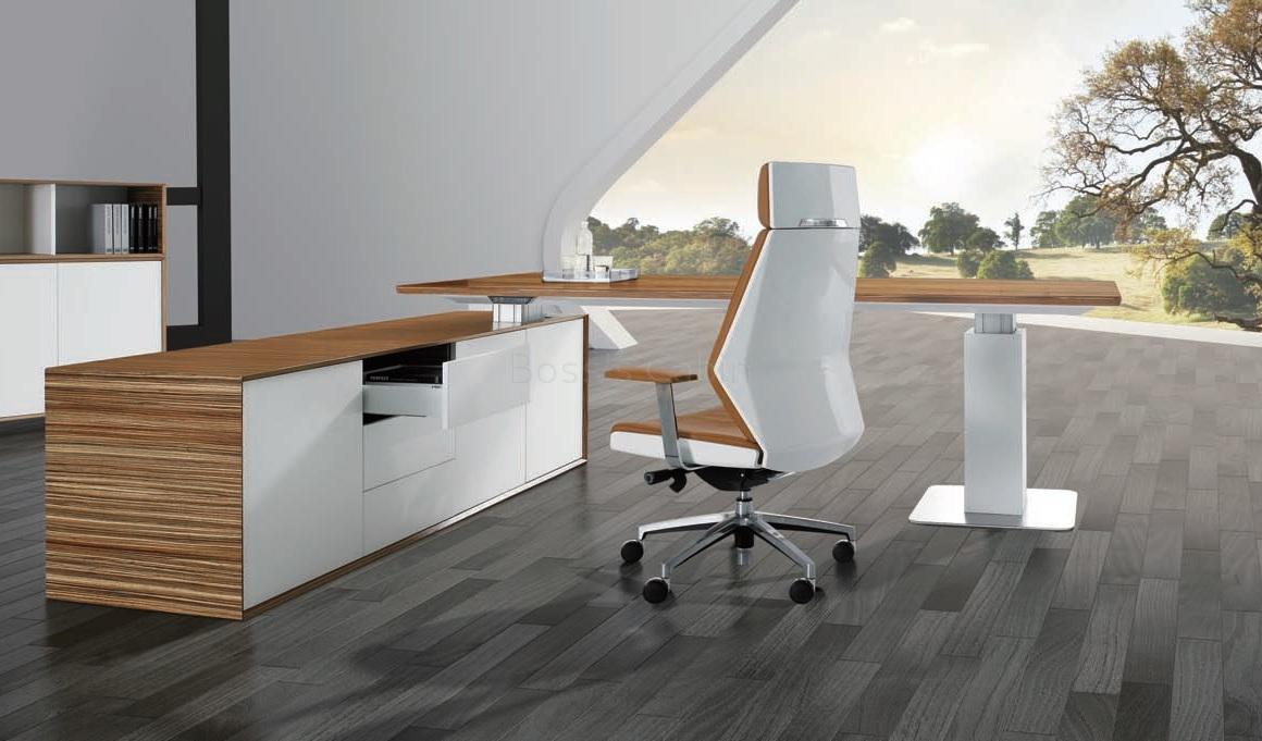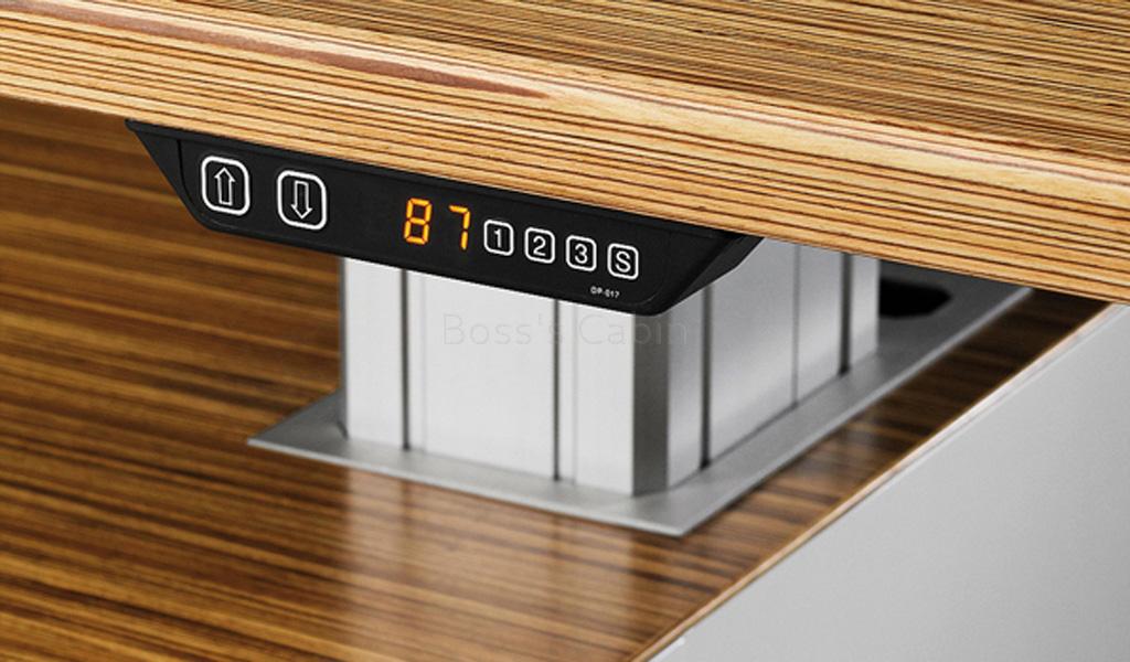 A premium build L shape height adjustable office desk fitted with a state of the art mechanism from Linak, Denmark. Finished in rich and bold veneer harvested from the African zebrano tree this desk is an epitome of luxury and style. Designed by Red-Dot award winning team of German architect this contemporary masterpiece is is built for lasting durability, natural feel and luxurious looks. An excellent choice for modern interiors it is part of the futuristic iWork series from which you can choose an entire range of matching office furniture like file cabinets, smaller office tables, conference tables etc to furnish an entire work place.