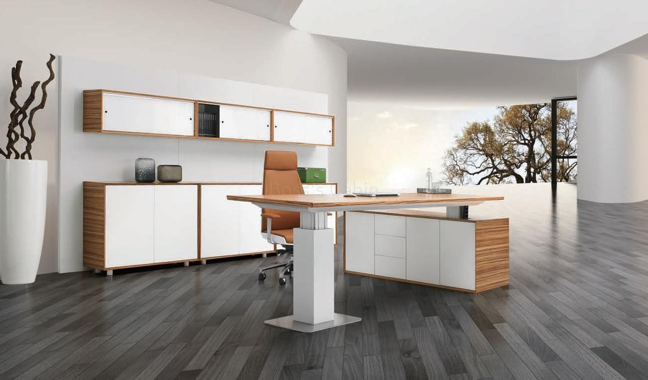 L shape office desk with side credenza with a smooth and silent height adjustable mechanism from Linak of Denmark. The height of the worktop can be adjusted up from 750 mm up to 1200 mm. Its touch sensitive buttons and built in memory can store up to three different preferred heights. Other components include Hettich rebound sliders, FGV rebound hinges, wire box and BMB lock.