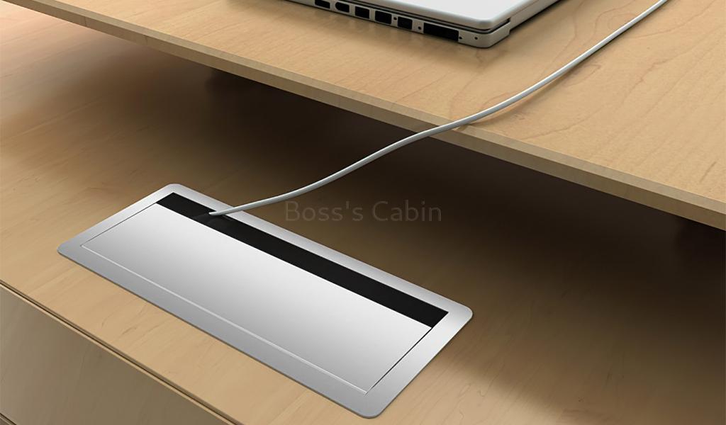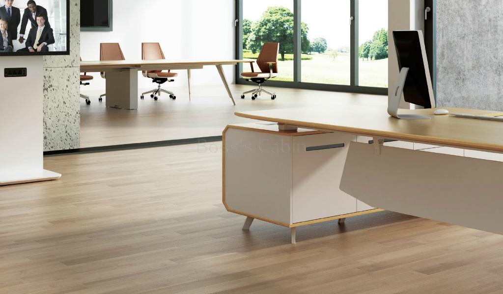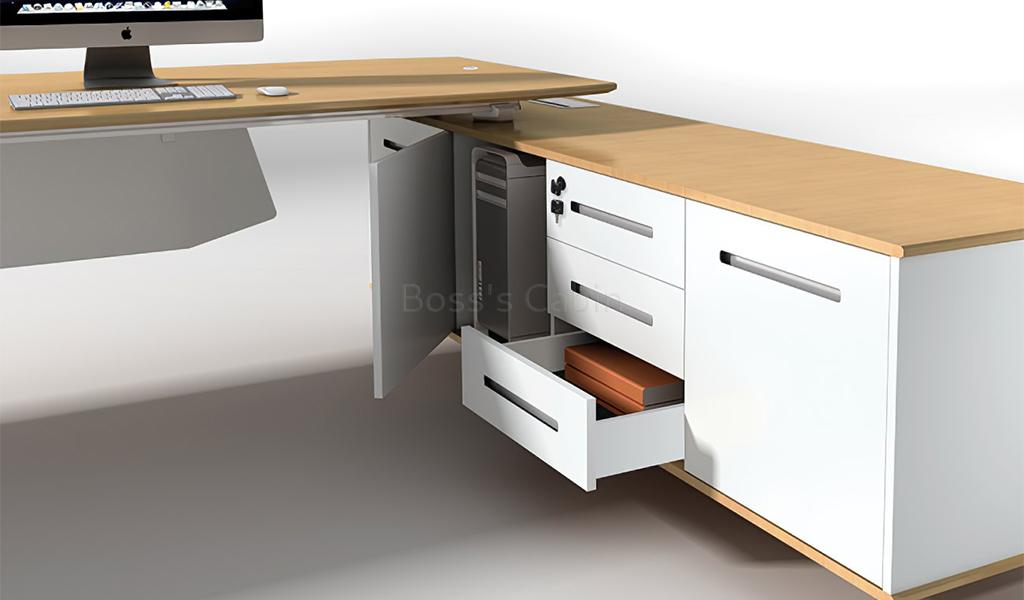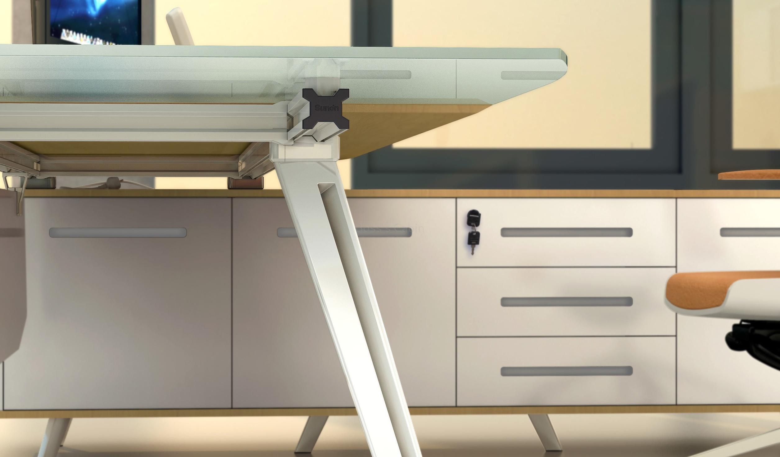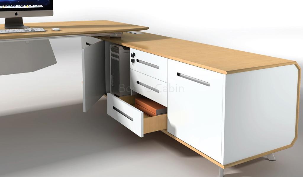 This premium Kross Series 9 feet desk is designed with a modern silhouette with geometric precision. The maple veneer desktop is complemented with a 12 MM frosted glass extension and a sleek side cabinet. The laser-cut aluminum alloy slanted legs provide both style and stability. Integrated features like the aluminum alloy flip wirebox, FGV damping hinges, Hettich slide rails, BMB lock, and a built-in wireless mobile charger make it as functional as it is elegant. Perfect for a large executive office, it blends innovation with minimalist luxury.