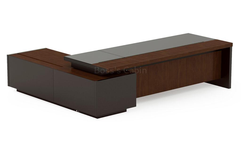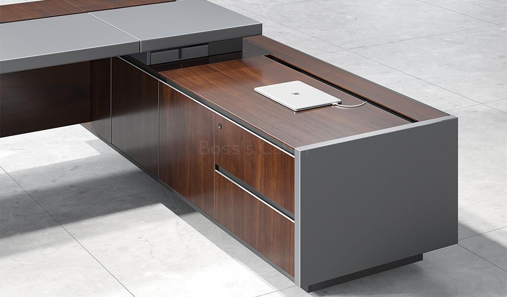 A grand 9 feet office table, luxuriously finished in mountain-grain walnut veneer and gray leather. It features an integrated side cabinet with matching veneer panels and a biometric smart lock. The leather-clad desktop conceals a wireless charging station, while a built-in panel offers HDMI, power, data, and network ports. Premium FGV damping hinges and Hettich soft-close rails ensure smooth, silent function. Part of the prestigious Larry series, the desk defines elegance and technological sophistication.