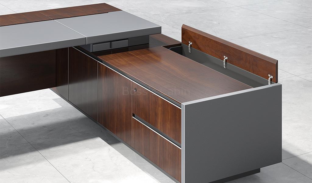 Thoughtful Convenience Features – Various parts of the desk sport thoughtfully designed features. The storage area of the side cabinet is designed with a combination of doors and drawers with socket provision provided in the CPU storage area.