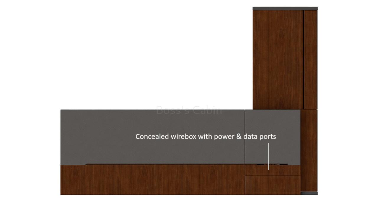 In-built Slim Wire Management Panels – The tabletop features a concealed wirebox with power, CAT.6, HDMI, and telephone ports, hidden beneath a matching walnut veneer lid for a seamless look. A chamfered groove allows device connection even when closed. An additional wire panel on the side cabinet includes cutouts for extra sockets, ensuring efficient cable management throughout.