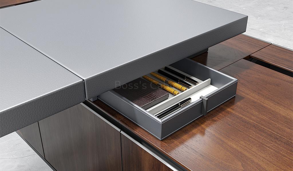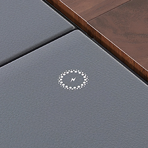 Integrated Wirless Charger – Our focus on luxurious finish is reflected in minute detailing that quietly enhance the richness and functionality of the desk. The concealed wireless charger embedded on the desktop is a case in point. The charger is discretely concealed under the leather pad that lets you charge your phone without any visible charging point in site.