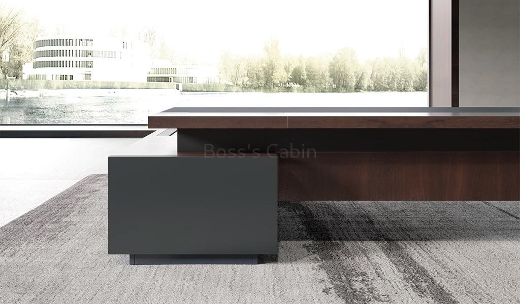 A grand 9 feet office table, luxuriously finished in mountain-grain walnut veneer and gray leather. It features an integrated side cabinet with matching veneer panels and a biometric smart lock. The leather-clad desktop conceals a wireless charging station, while a built-in panel offers HDMI, power, data, and network ports. Premium FGV damping hinges and Hettich soft-close rails ensure smooth, silent function. Part of the prestigious Larry series, the desk defines elegance and technological sophistication.