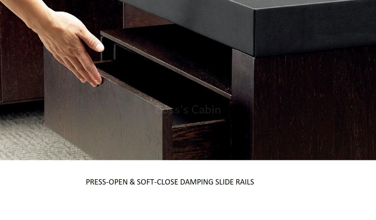 A finely crafted presidential office table finished in dark oak veneer, genuine leather and lacquer. Includes side cabinet, desk top embedded wireless mobile charger, multi-functional wirebox with VGA, power, data and telephone ports, Hettich rebound slide rails and FGV damping rebound hinges.