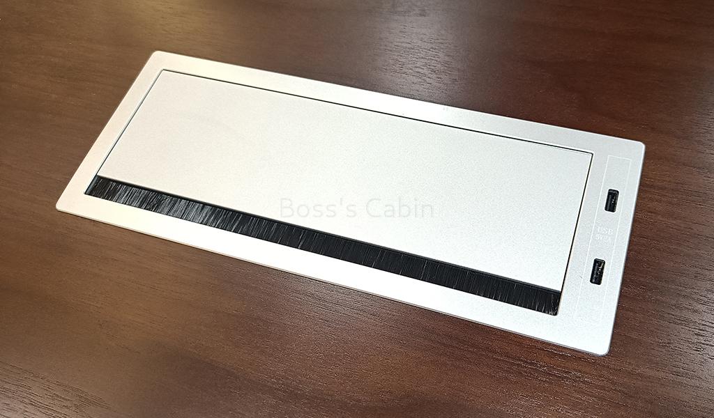 Office table with side return, embedded leather writing pad, side return, three drawers under desktop, two multi-functional wire box for power and other connectivity and an inbuilt desktop wireless charger.