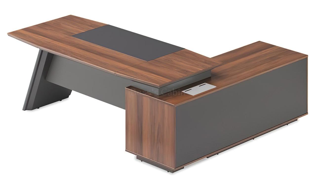A mid-sized, minimalist desk designed for modern workspaces. Features a distinctive slanted leg and a dual-tone bevel-edged work surface finished in leather and premium walnut laminate. An integrated side cabinet includes a number lock and a wirebox with power, CAT.6 network, HDMI, and USB ports. Additional features include a pull-out leather accessory tray and a wireless mobile charging station embedded in the desktop. Part of the Maxima series it is well-suited for executive cabins of 200 sq. ft. or more.