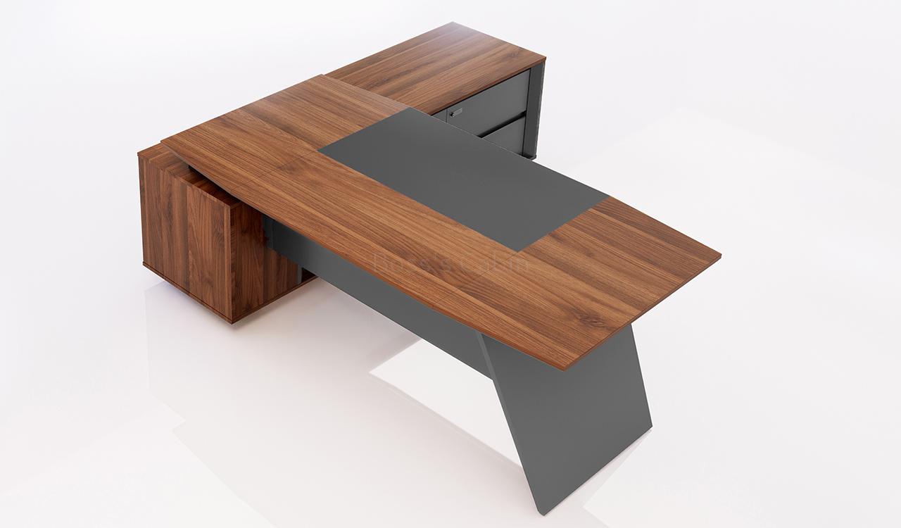 1. Main office desk in warm walnut laminate and leather. 2. Side cabinet with inbuilt wire management box with data and power ports.