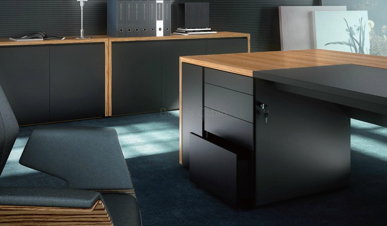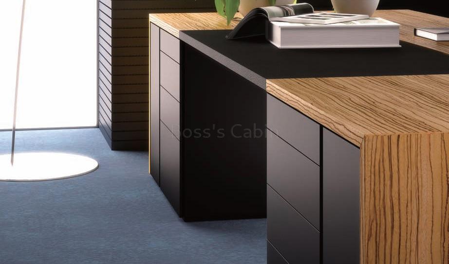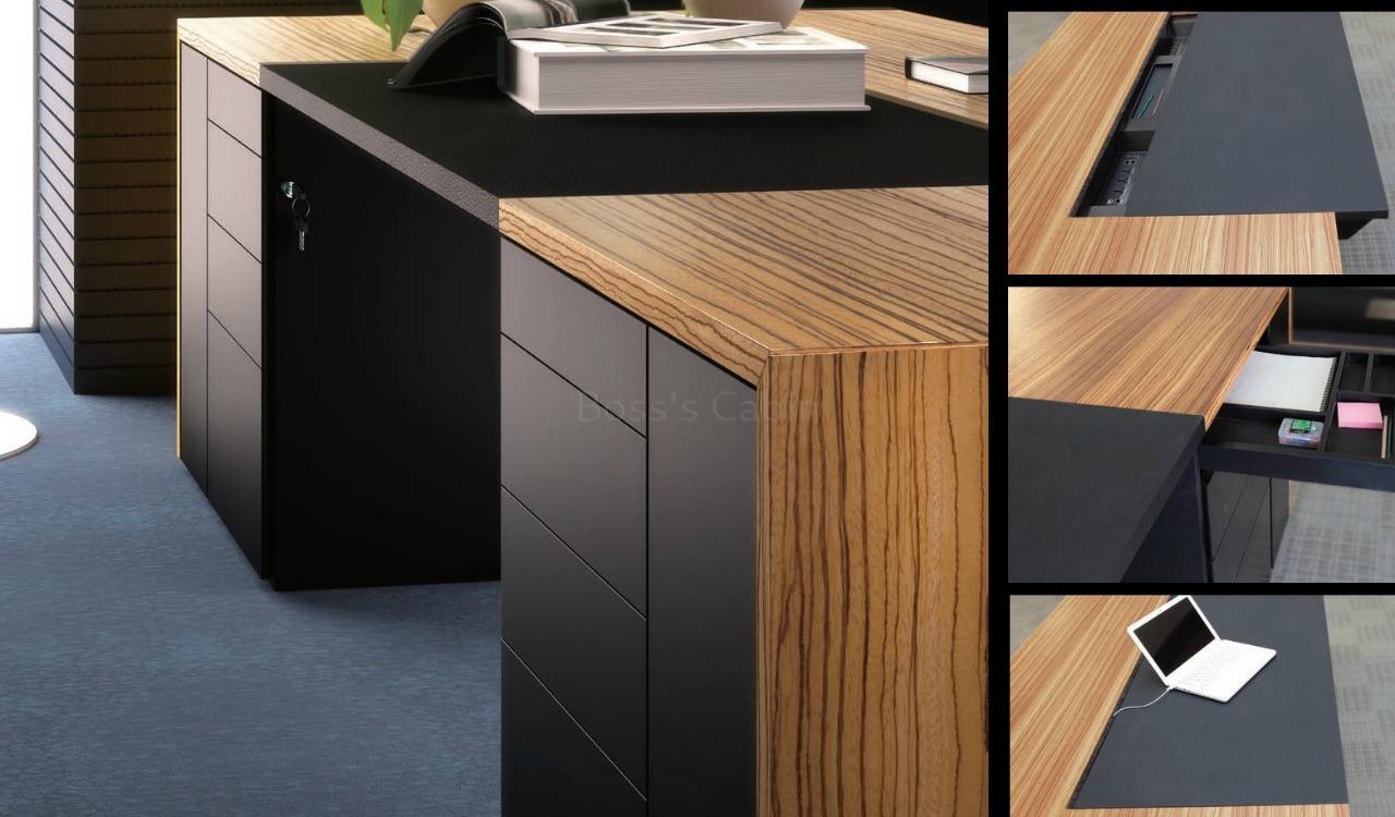 An elegantly designed, zebra veneer finish office table suitable for large and contemporary work spaces. Designed by the prestigious Red-Dot award winning team of German architects this high end executive desk has a unique bridge span design with a sliding leather writing pad on desktop. It slides forward to reveal a concealed wirebox with sockets that provides a clutter free connection to all your devices. Impeccably crafted and finished, it is built for lasting durability, natural feel and luxurious looks. It is part of the Status series from which you can choose an entire range of matching cabinets, larger tables, conference tables etc to create a complete office. Go to our catalog section to download the pdf brochure of this range.