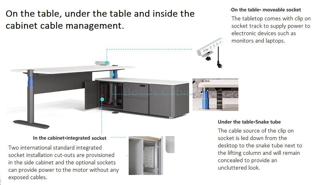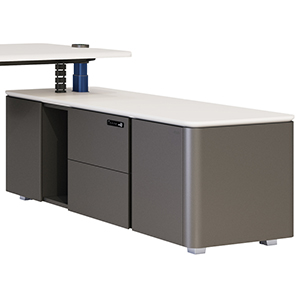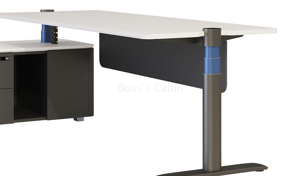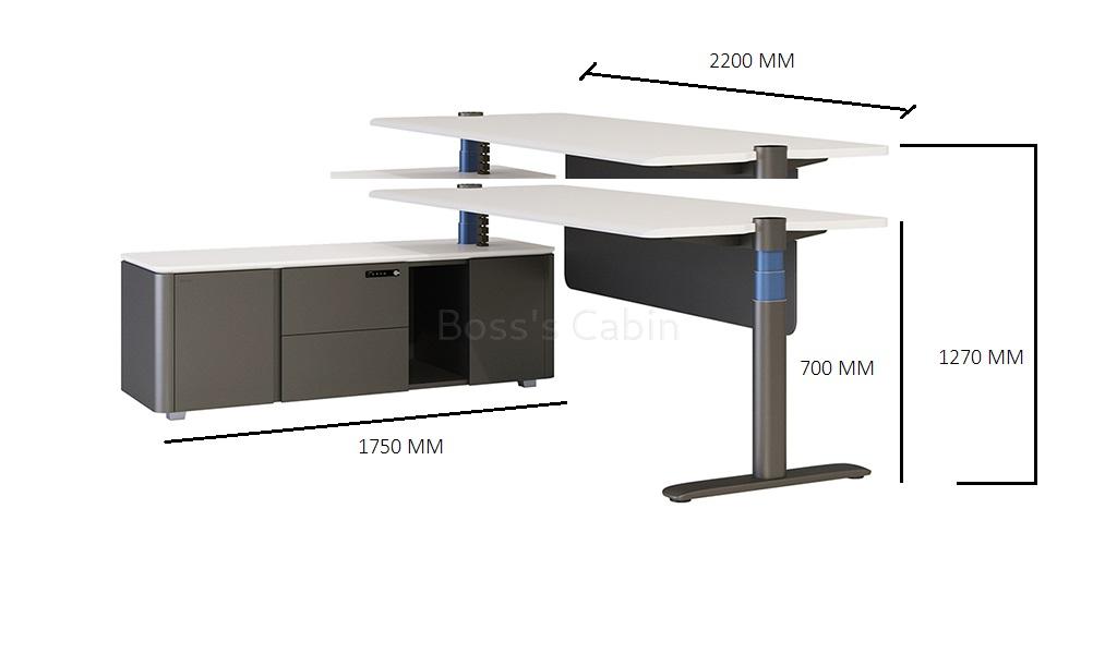 With 10 patents and 2 soft copy rights and 7 unique features the UP-7 is virtually the desk of the future. The UP-7 gets its name from seven first time features that the desk comes with. 1 – First to apply special spray paint that is skin friendly. 2 – First to design the control panel on both sides of the desk. 3 – First to adopt I shaped lifting column making the column flush with the tabletop. 4 – First to use dual tones in the lifting column. The outer column in meteor gray and inner in ink blue. 5 – First to adopt comprehensive cable management system. 6 – First to introduce intelligent sensor technology. 7 – First to design side cabinet with steel body with chamfered wooden top.