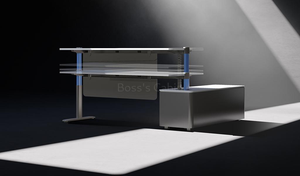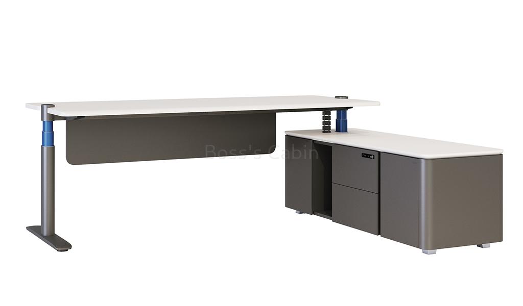 A cutting-edge technology futuristic height-adjustable office desk featuring OLED screen control panel for smooth, quiet motorized operation at the touch of a finger. Designed with a futuristic aesthetics, it is finished in dual tones of white and meteor gray, complemented by a dual-tone leg in spray-painted meteor gray and ink blue. Additional features include a suspended modesty panel, side cabinet with biometric smart lock and coil tube. A perfect choice for a dynamic, tech-savvy, and vibrant workspace.