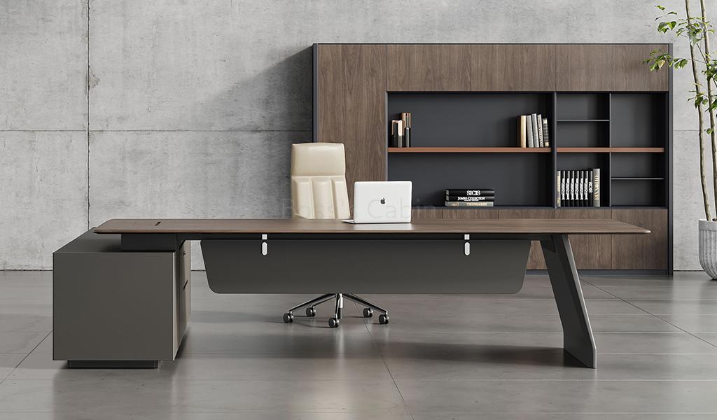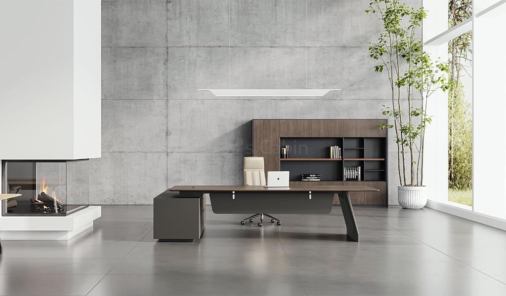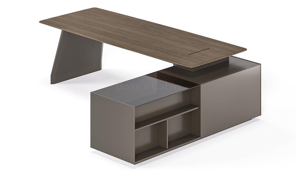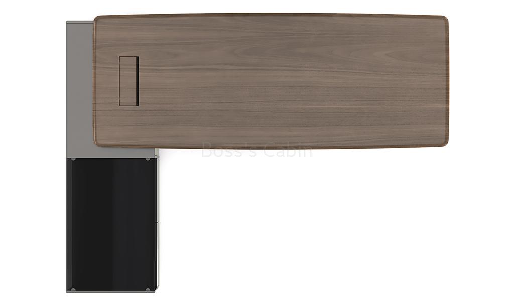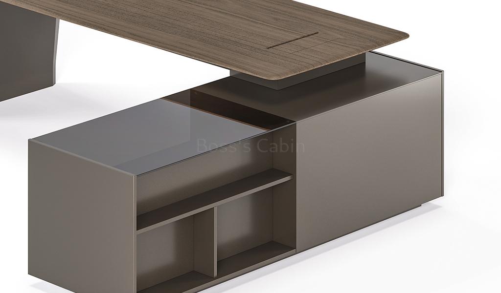 A Unique Combination of Multiple Surface Textures – Our objective of a luxurious finish is achieved by minute detailing and design elements that quietly enhance the richness of the desk. The Varna is designed using a combination of warm, open pore black walnut veneer, mocha colored glossy lacquer, brown tinted glass and meteor gray smooth laminate. The multi textured surfaces are conceived to impart the desk a timeless elegance with vibrant modern looks.