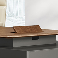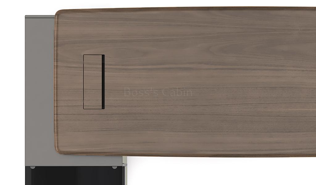 Seamlessly Integrated Wire Management – The Varna is equipped with inbuilt wire management system to internally route all wirings connecting to the wirebox placed on the desktop. The wirebox itself is covered with the same veneer finish as the desktop making it merge with the grains of the rest of the tabletop. The wirebox includes three power and one internet ports. The groove of the wirebox is equipped with a brush strip to prevent dust accumulation inside.
