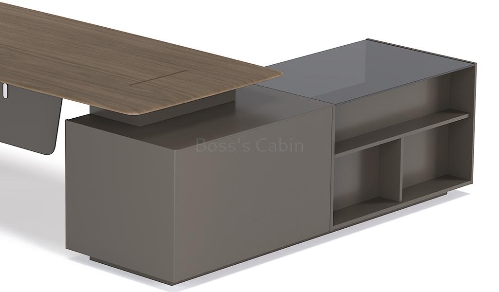 A modern office table finished in black American walnut veneer, gray tinted glass, mocha color lacquer and meteor gray laminate. Desktop with chamfered edges and base with diamond cut, slanted, monolithic panel leg. Side cabinet with tinted glass top, lacquered doors, electronic biometric lock and open shelves on the outer side. Desktop equipped with flip-open multi functional wirebox with power and internet sockets. Fitted with FGV damping hinges and Hettich slide rails. An excellent choice for a plush cabin.