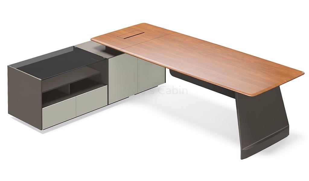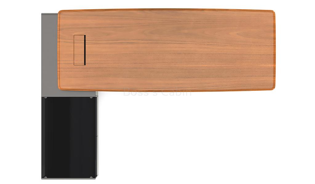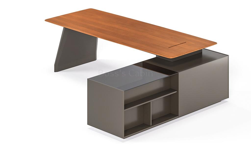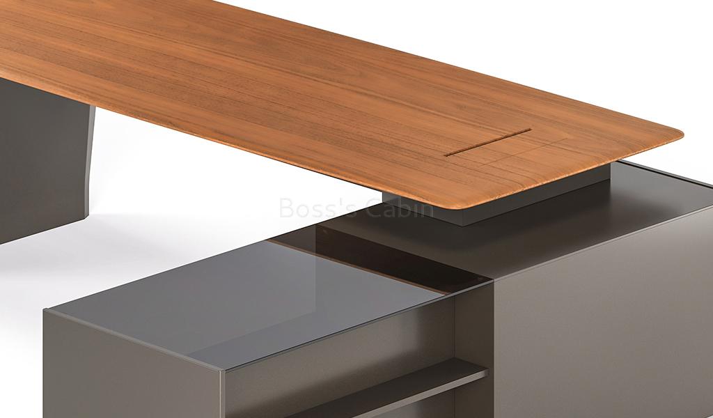 A Unique Combination of Multiple Surface Textures – Our objective of a luxurious finish is achieved by minute detailing and design elements that quietly enhance the richness of the desk. The Varna is designed using a combination of warm, open pore walnut veneer, mocha colored glossy lacquer, brown tinted glass and meteor gray smooth laminate. The multi textured surfaces are conceived to impart the desk a timeless elegance with vibrant modern looks.