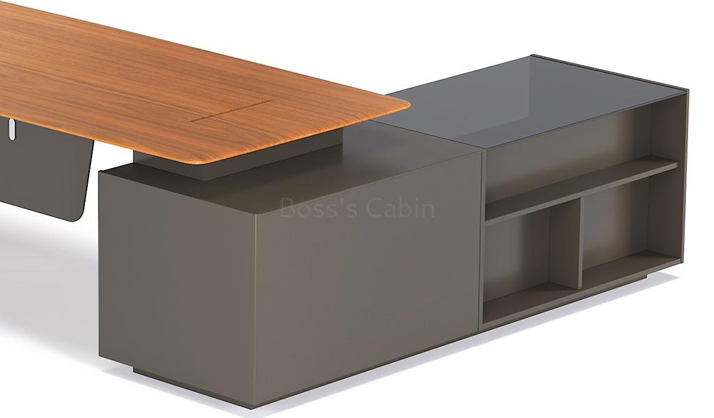 A modern office table finished in walnut veneer, gray tinted glass, mocha color lacquer and meteor gray laminate. Desktop with chamfered edges and base with diamond cut, slanted, monolithic panel leg. Side cabinet with tinted glass top, lacquered doors, electronic biometric lock and open shelves on the outer side. Desktop equipped with flip-open multi functional wirebox with power and internet sockets. Fitted with FGV damping hinges and Hettich slide rails. An excellent choice for a plush cabin.
