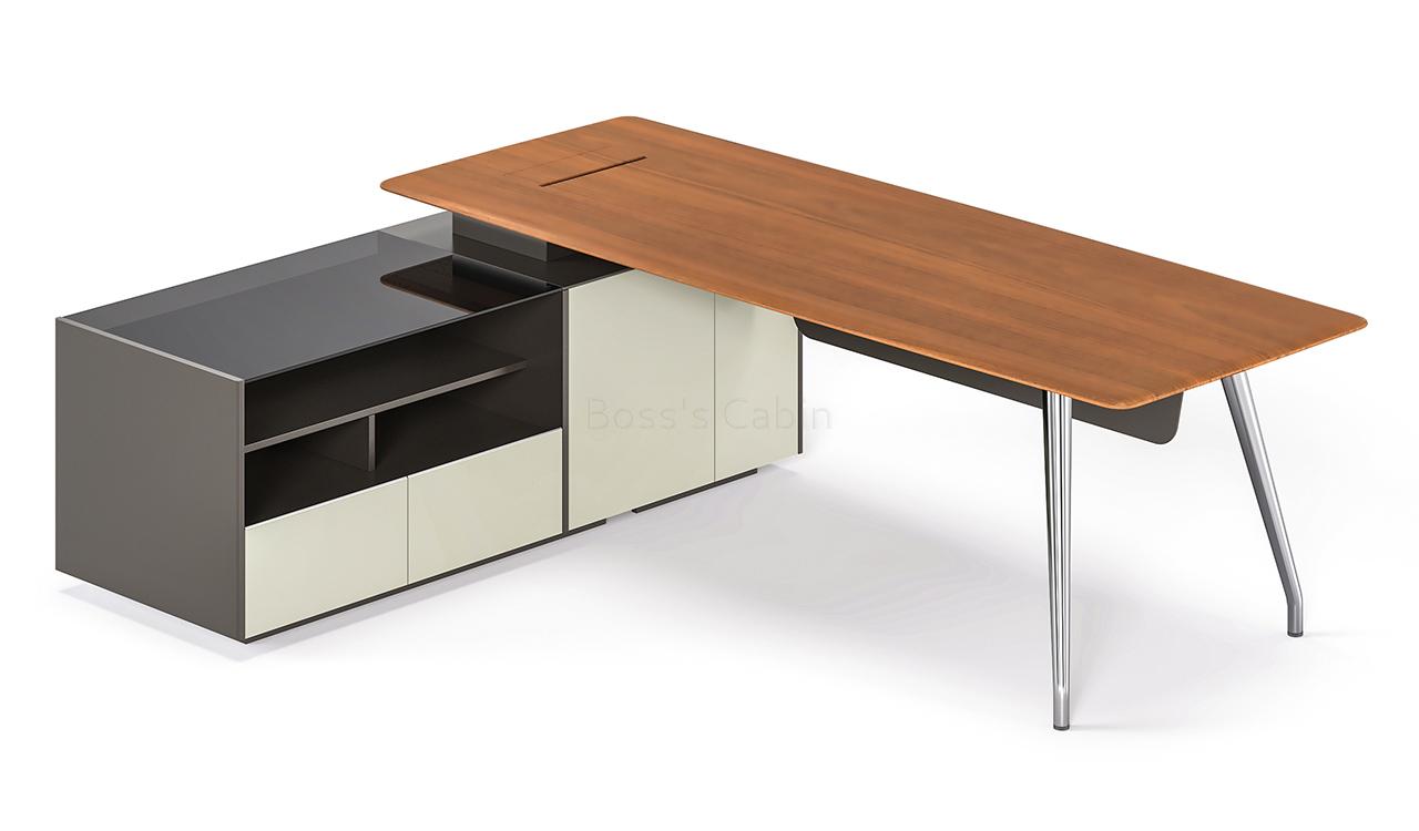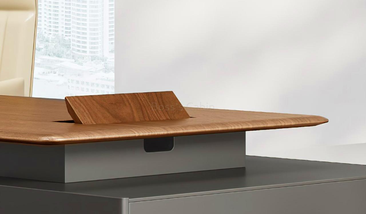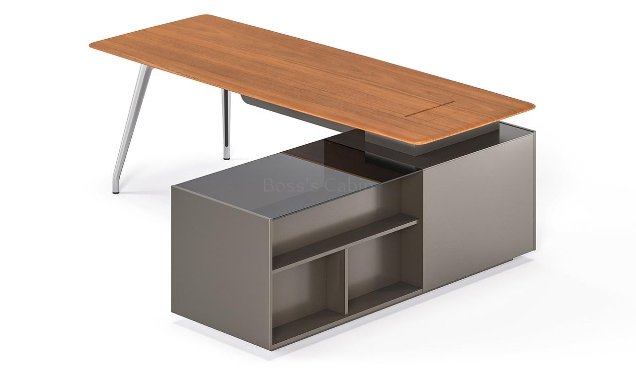 A Unique Combination of Multiple Surface Textures Our objective of a luxurious finish is achieved by minute detailing and design elements that quietly enhance the richness of the desk. The Varna is designed using a combination of warm, open pore walnut veneer, mocha colored glossy lacquer, brown tinted glass and meteor gray smooth laminate. The multi textured surfaces are conceived to impart the desk a timeless elegance with vibrant modern looks.