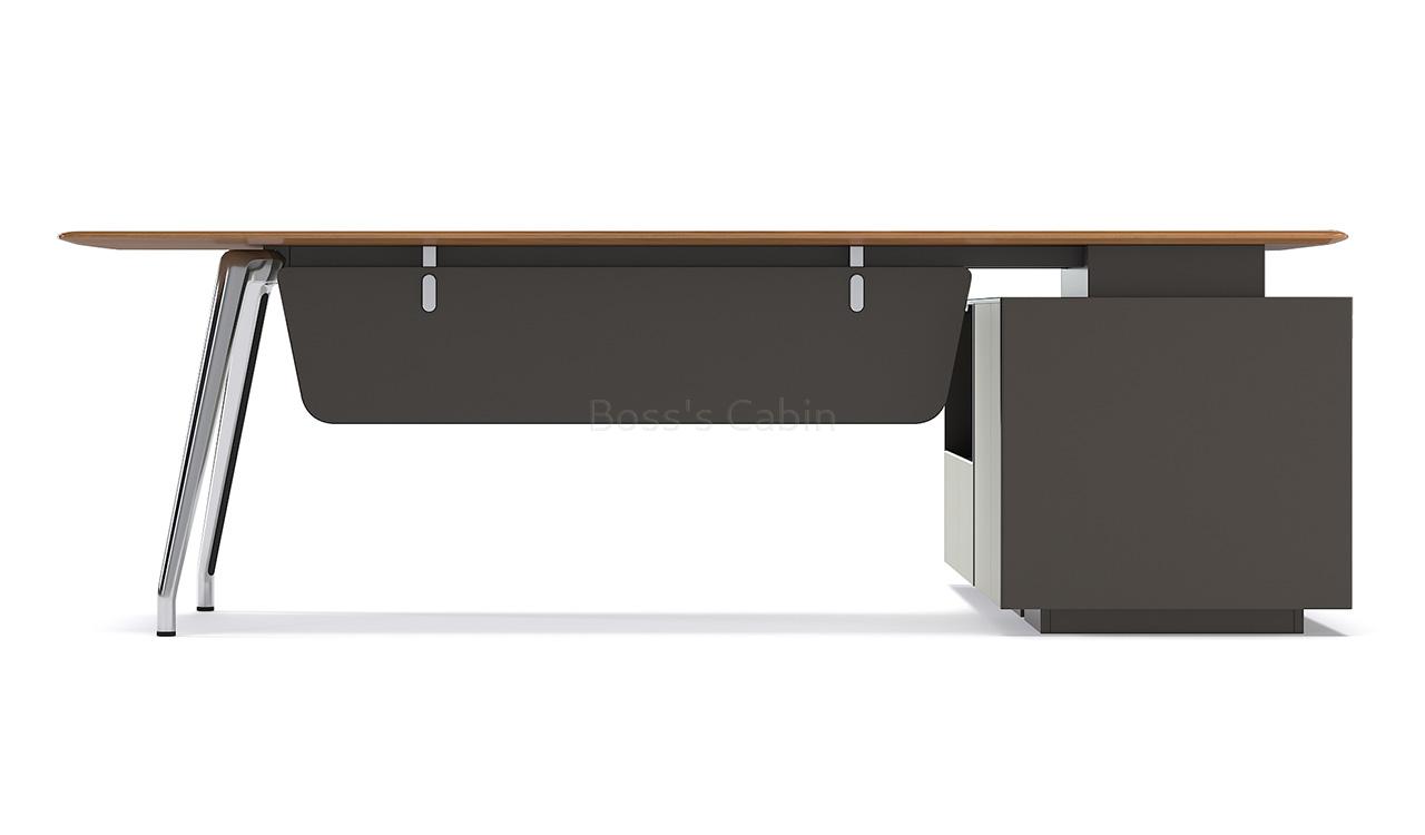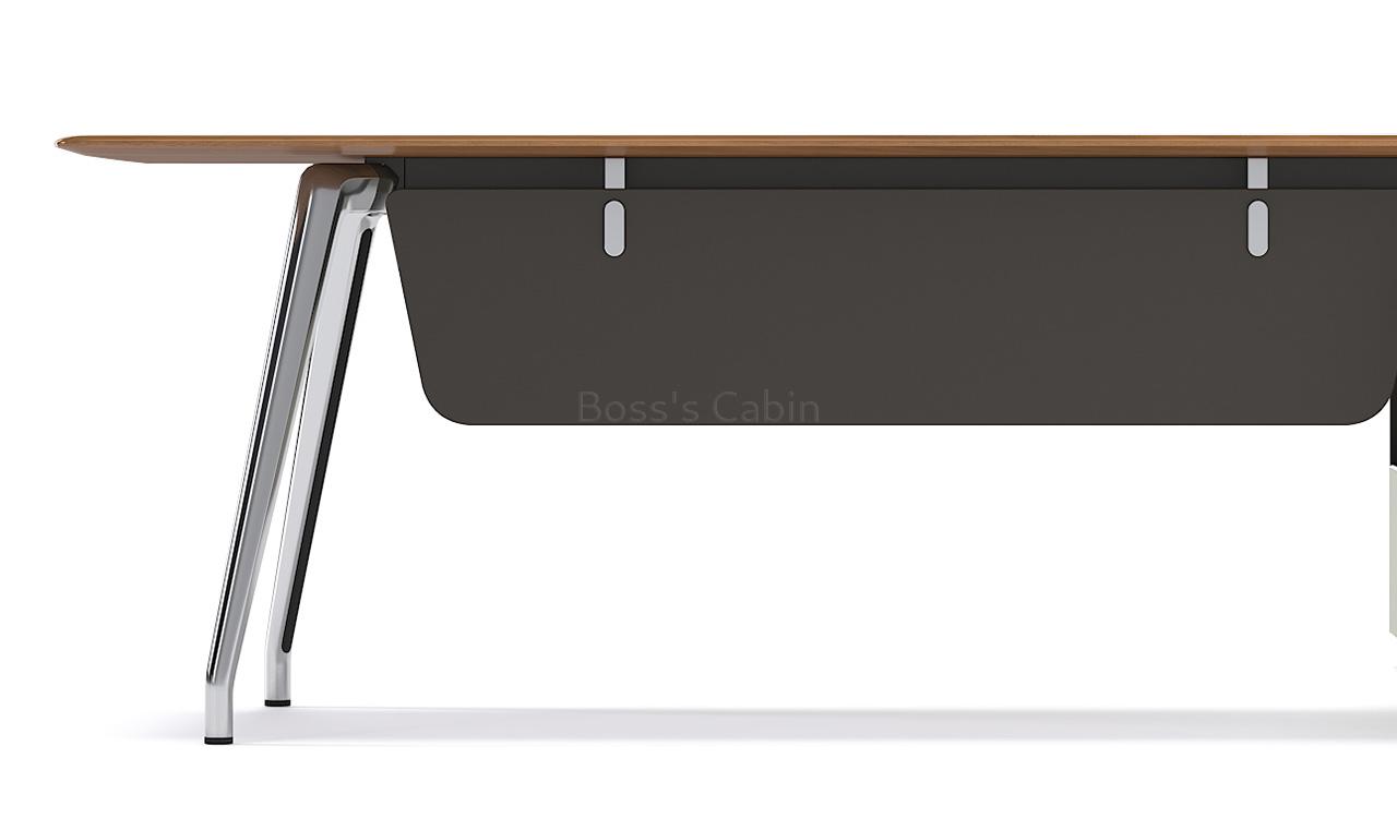 Art, Creativity & Integration – The slanted aluminum alloy leg of the Varna is a specially created piece of art involving multiple processes. The 3D molded, VFF polished leg has not one, not two but 6 diamond like facets which simulate the graceful muscles of a ballerina. The leg tapers smoothly from a wider top to a slimmer base that is shaped like the arch of a ballerina’s ankle supported on the big toe. The multi-dimensional, muscular leg imparts the desk with a confident & powerful character.