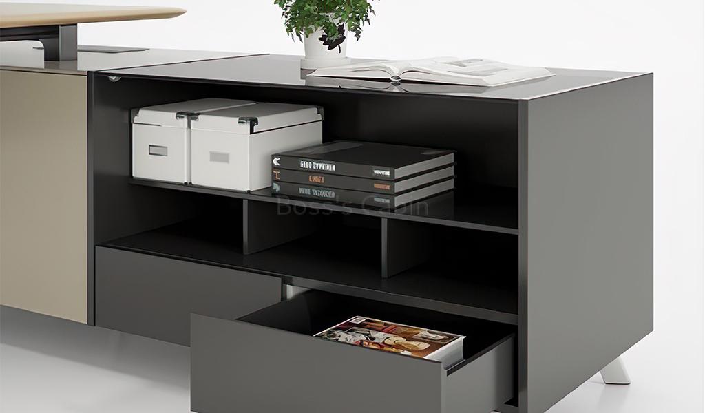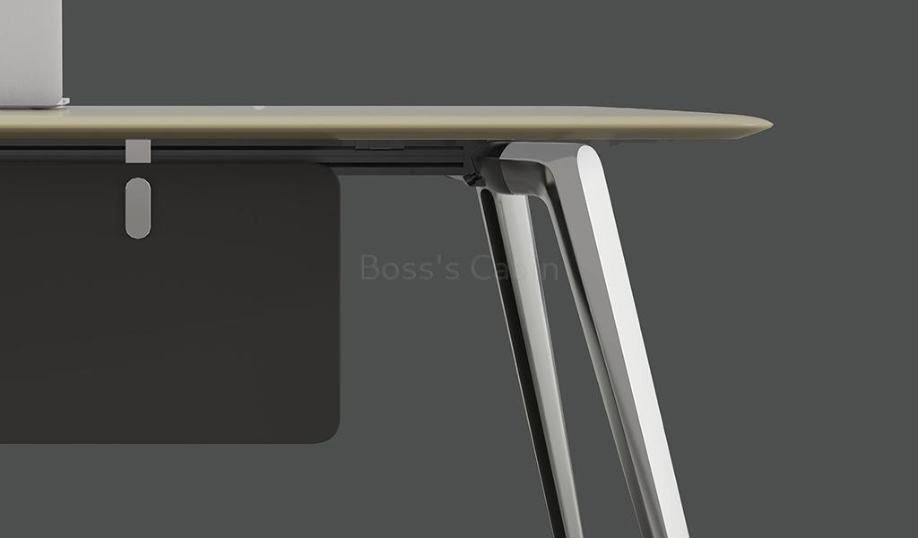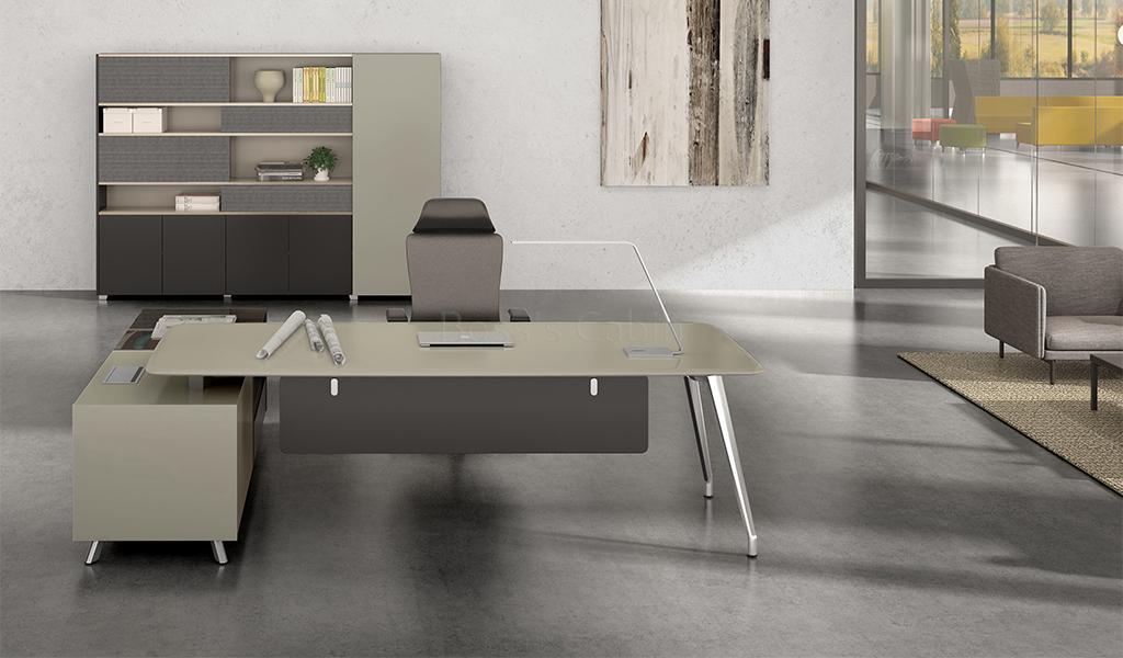A contemporary office desk finished in taupe color lacquer and meteor gray laminate. Desktop with chamfered edges, aluminum alloy legs & frame, modesty panel, side cabinet with grey tempered glass, concealed wire management system and flip-open multi functional wirebox with VGA, power, network and telephone sockets. Fitted with FGV damping hinges and Hettich slide rails. An excellent choice for a plush cabin.