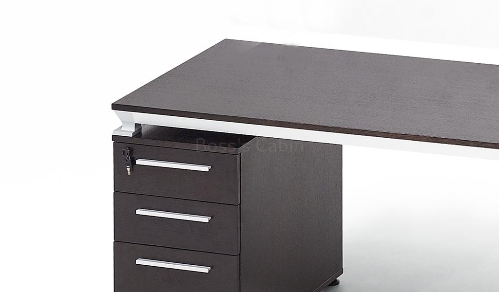 A compact 4.5 feet work desk finished in rich and textured oak wood veneer. Designed with a solid aluminum alloy base and frame it comes with a three drawer storage pedestal with a lock. Its rich natural wood veneer finish makes it an ideal choice for use as a study table as well as a desk for small and tastefully appointed cabins.