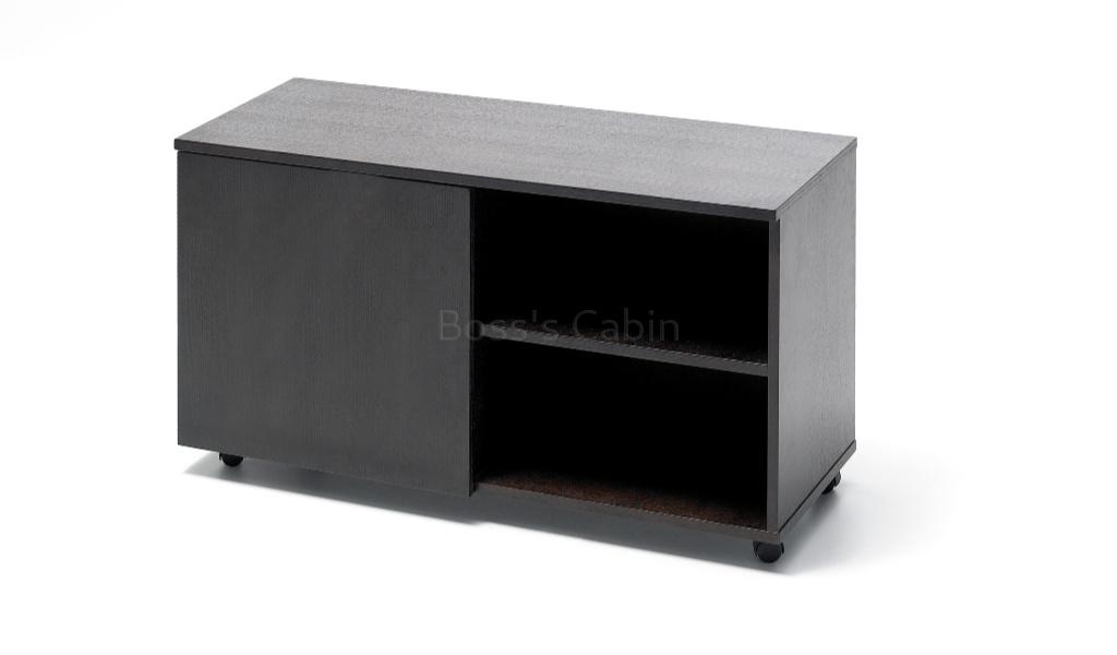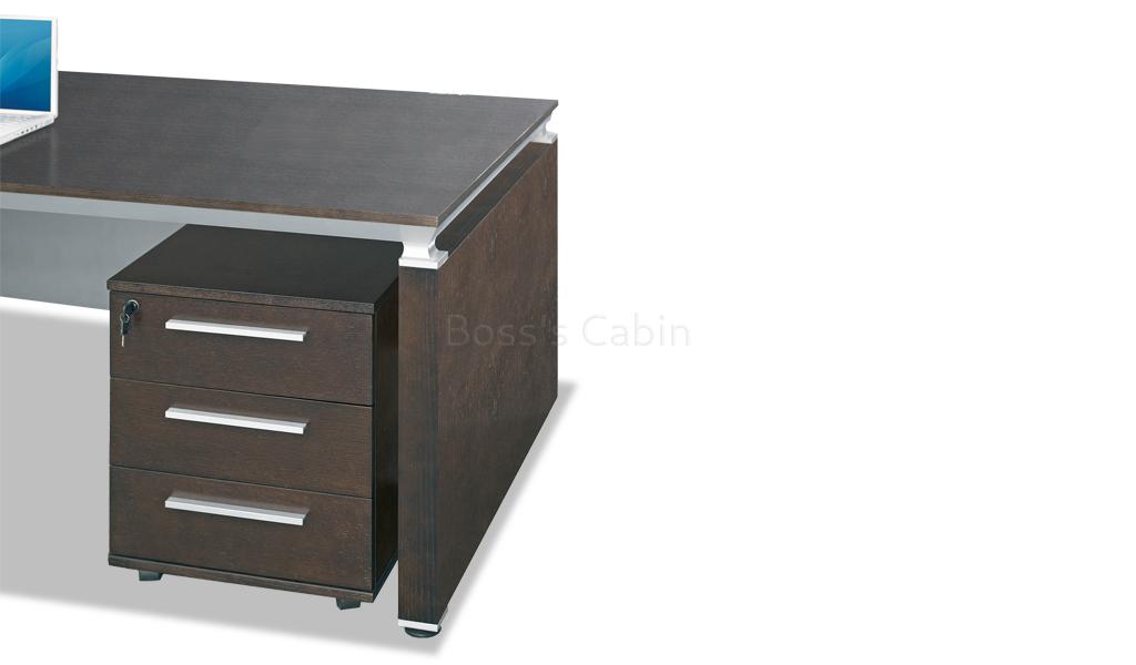 An elegant 5 feet office table in rich, open grain dark oak veneer. Includes work top with stylishly angled solid aluminum frame, veneered panel legs, side cabinet with storage and three drawer mobile pedestal with wheels. An excellent choice for small office cabins and home office.