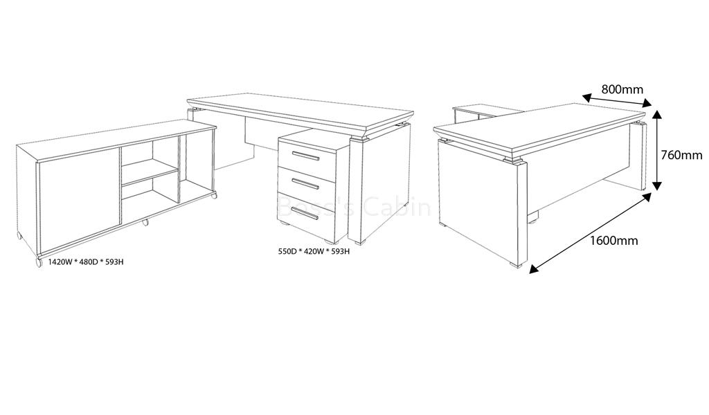 - 1600 W x 800 D x 760 H mm