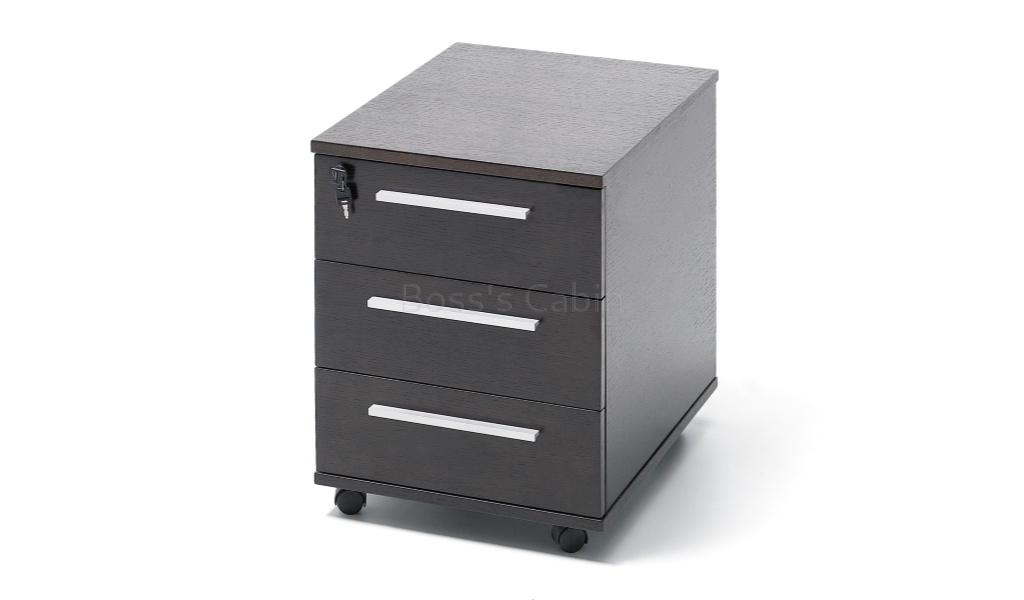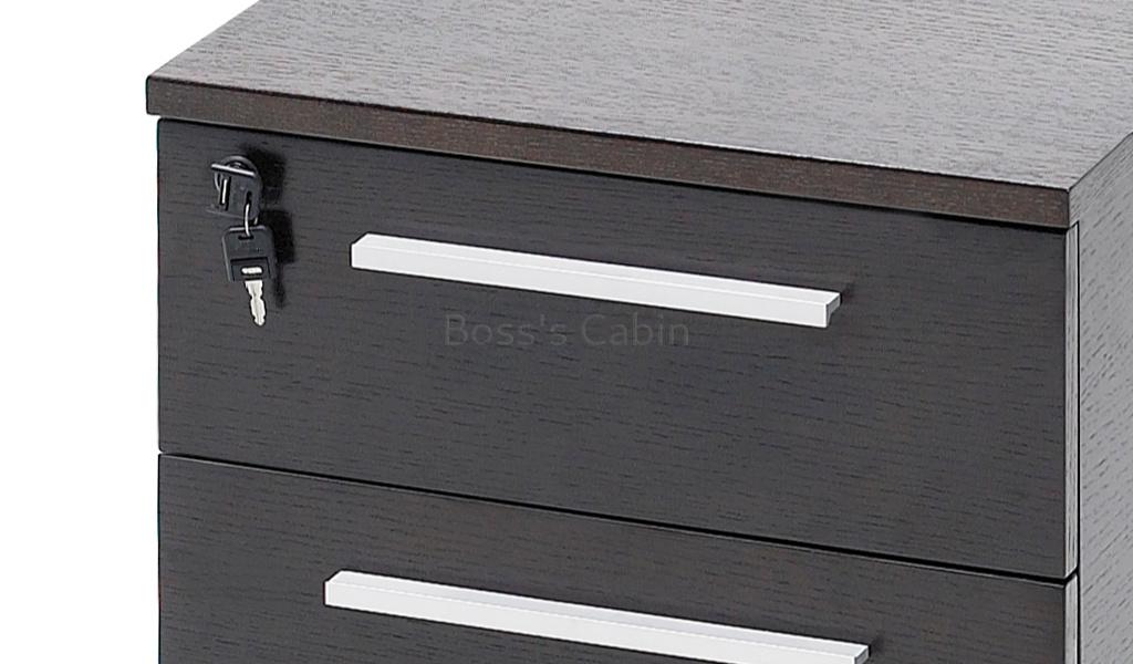 A compact and elegant 6 feet office desk in open grain, dark oak veneer. Part of our contemporary design series called Eazy, it is finished in a rich textured natural wood veneer. Designed with an aluminum alloy frame, veneered panel legs, side cabinet on castors and a three drawer mobile pedestal. Ideal for contemporary office cabins and study rooms.