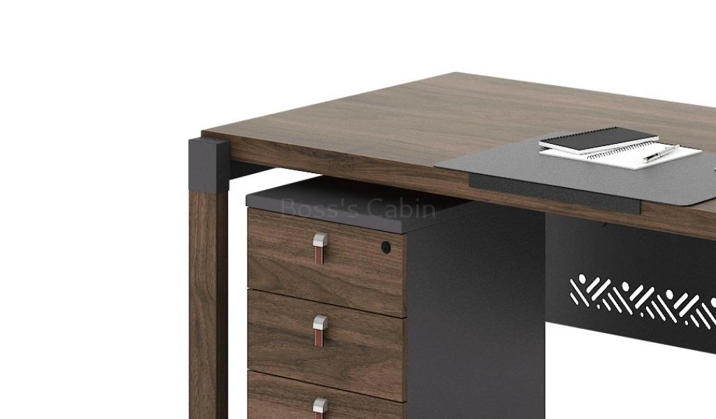 A compact 6 feet office desk in walnut laminate with mobile pedestal. Built with E1 grade MDF & natural wood finish walnut laminate for lasting durability, natural feel and luxurious looks. It is part of the Loft series from which you can choose an entire range of matching office furniture like file cabinets, smaller tables, conference tables etc to create a complete office.