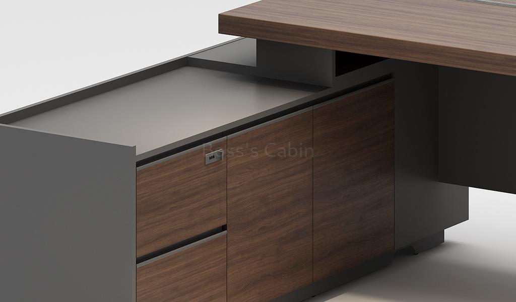 1. Main office desk in walnut laminate. 2. Side cabinet with inbuilt wire management and power ports.