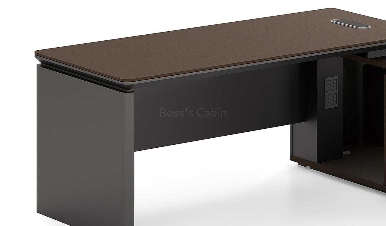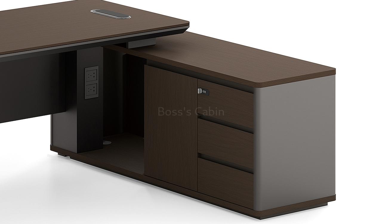 1. Dual tone tabletop in walnut & gray combination. 2. Side cabinet with swing door/open shelf & drawers with number lock. 3. Tabletop with integrated with wire routing grommet.