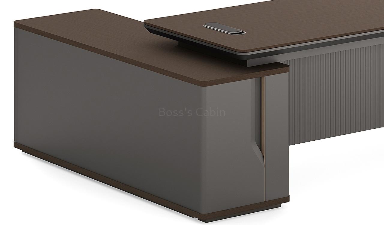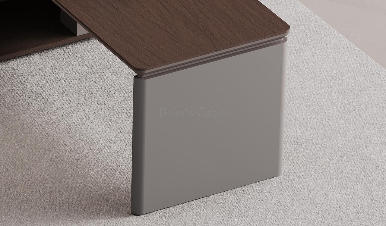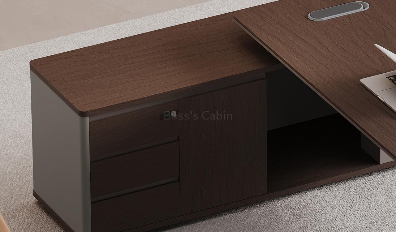 An elegant office desk in Nackle Walnut and X-Gray, ideal for modern interiors. The rounded-edge side cabinet includes number-locked drawers and swing-door storage with a shelf. The dual-surface, two-tone desktop features rounded and chamfered edges for a smooth, dynamic profile. A sleek wire-routing grommet ensures a clutter-free workspace. The luxurious grooved modesty panel is elaborately designed to elevate the setup. Ideal for cabins of 100 sq. ft. or more. Part of the Prima series, offering matching products for a cohesive workspace.
