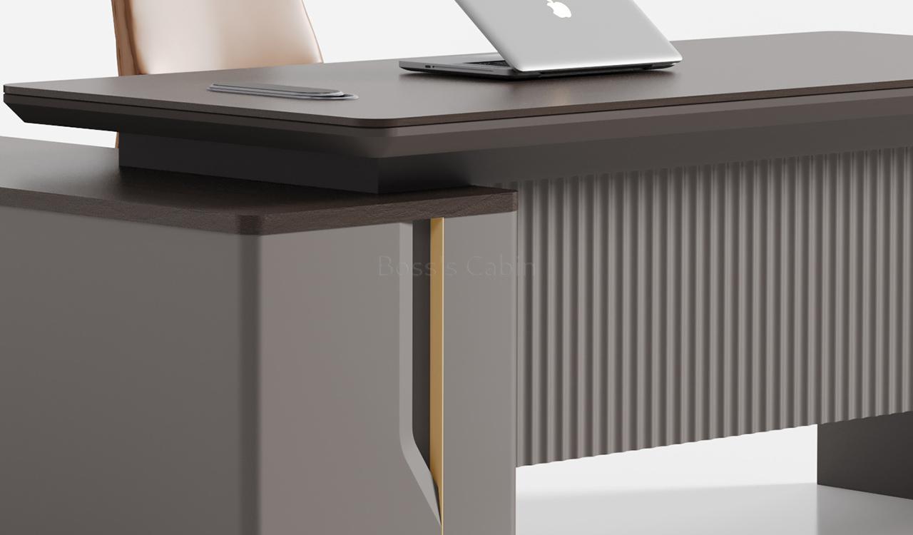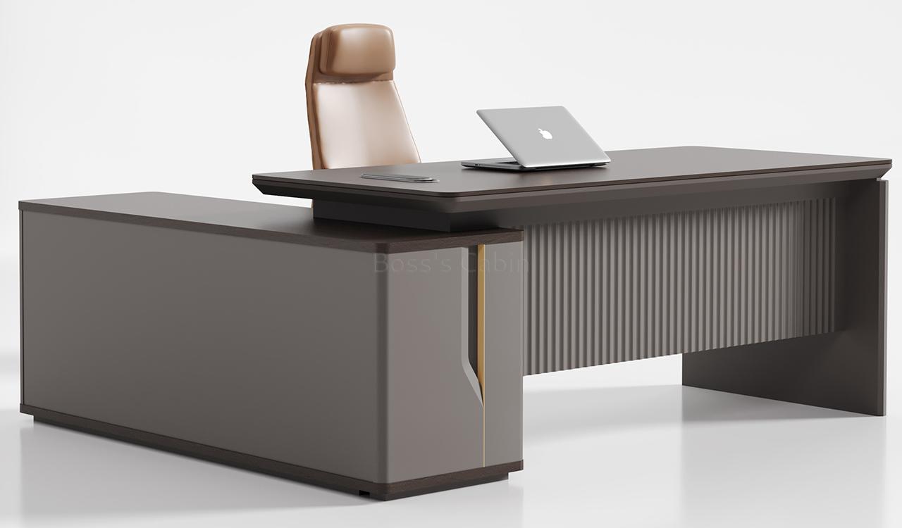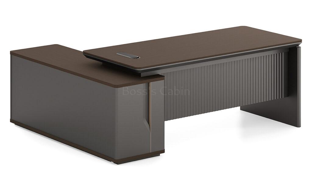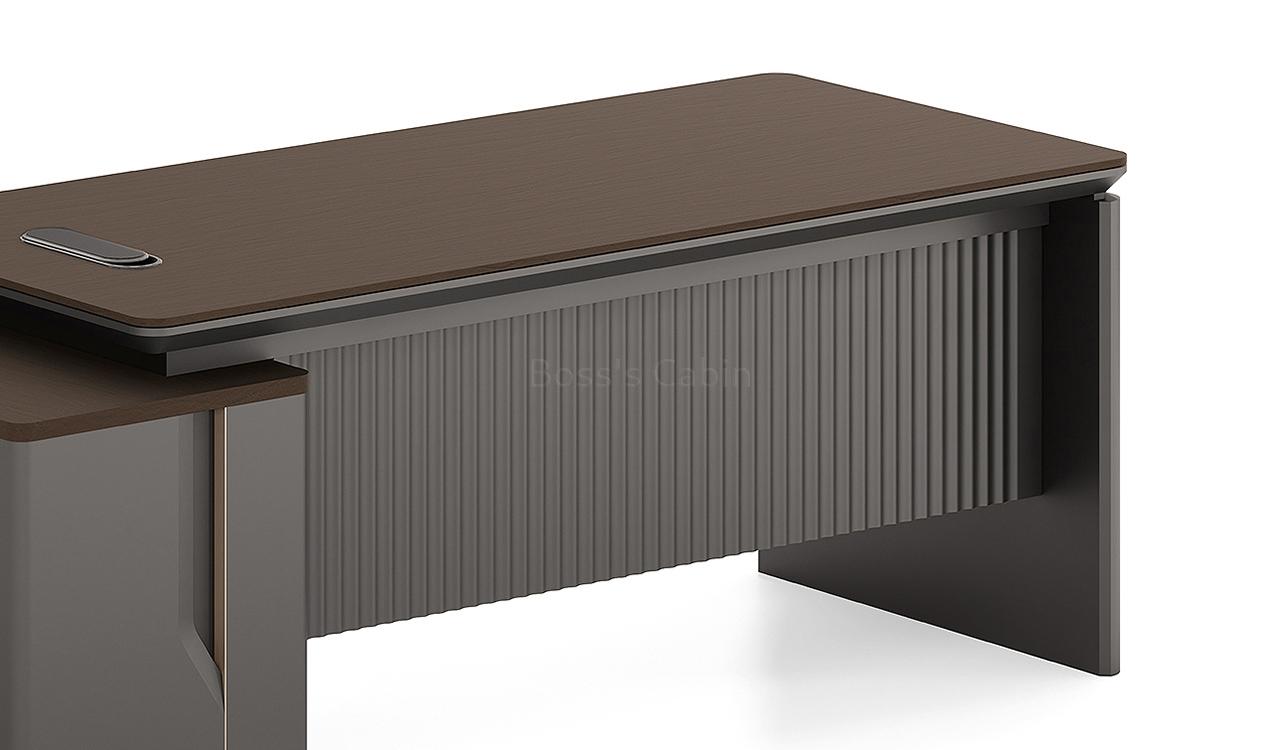 An elegant office desk in Nackle Walnut and X-Gray, ideal for modern interiors. The rounded-edge side cabinet includes number-locked drawers and swing-door storage with a shelf. The dual-surface, two-tone desktop features rounded and chamfered edges for a smooth, dynamic profile. A sleek wire-routing grommet ensures a clutter-free workspace. The luxurious grooved modesty panel is elaborately designed to elevate the setup. Ideal for cabins of 100 sq. ft. or more. Part of the Prima series, offering matching products for a cohesive workspace.