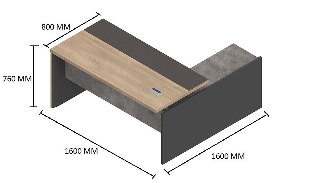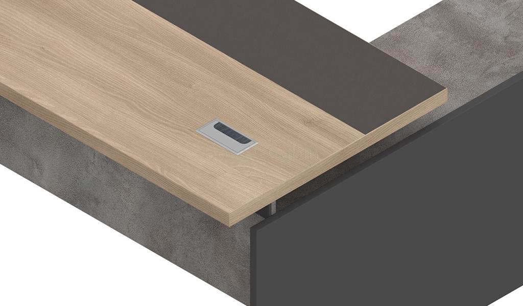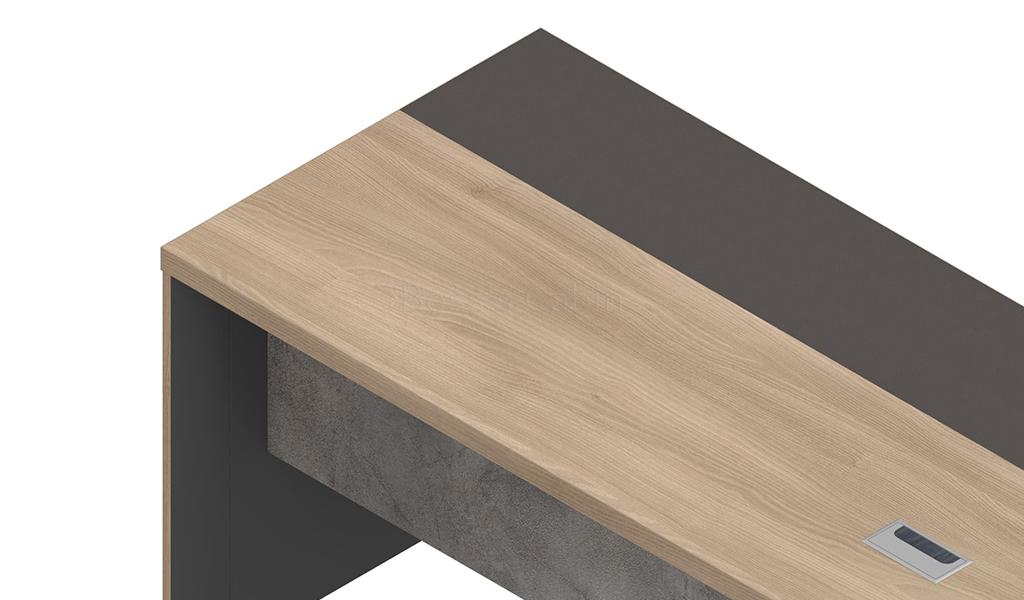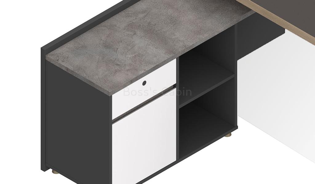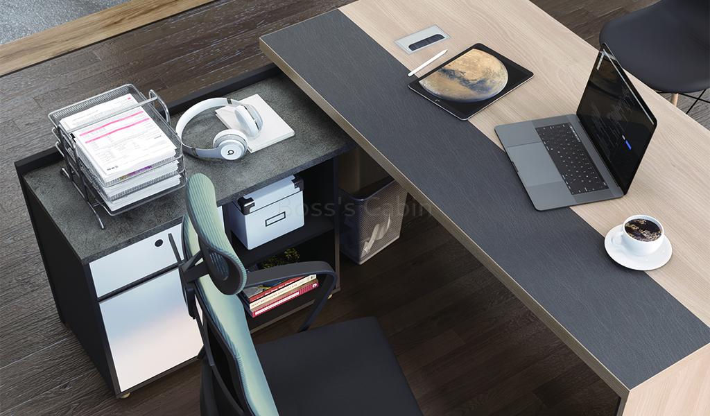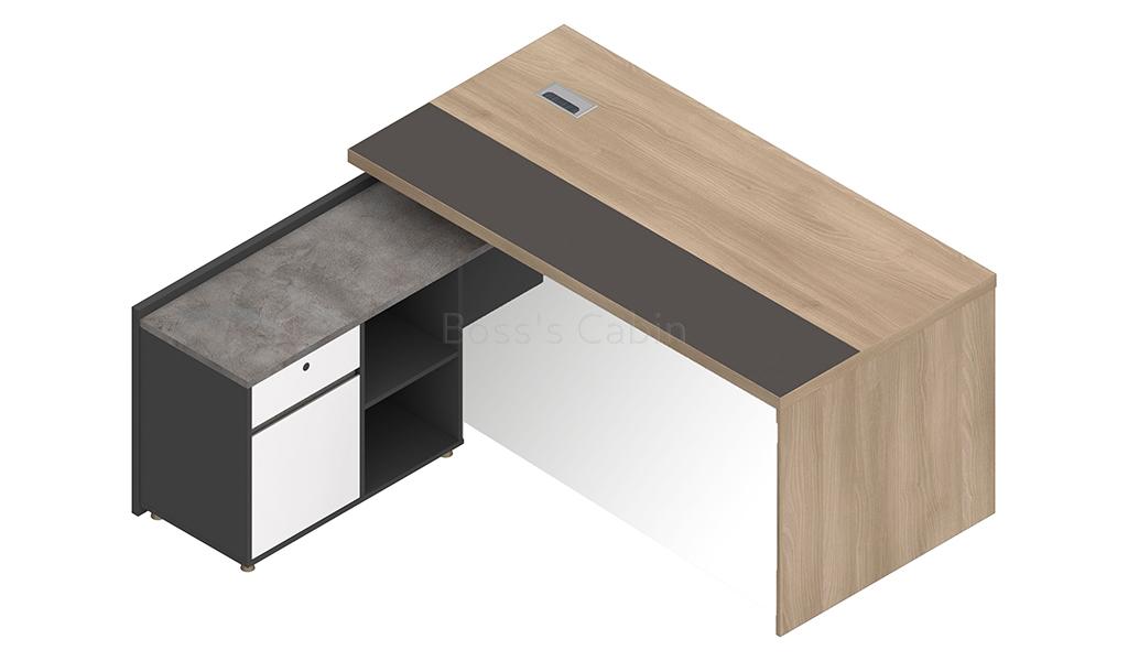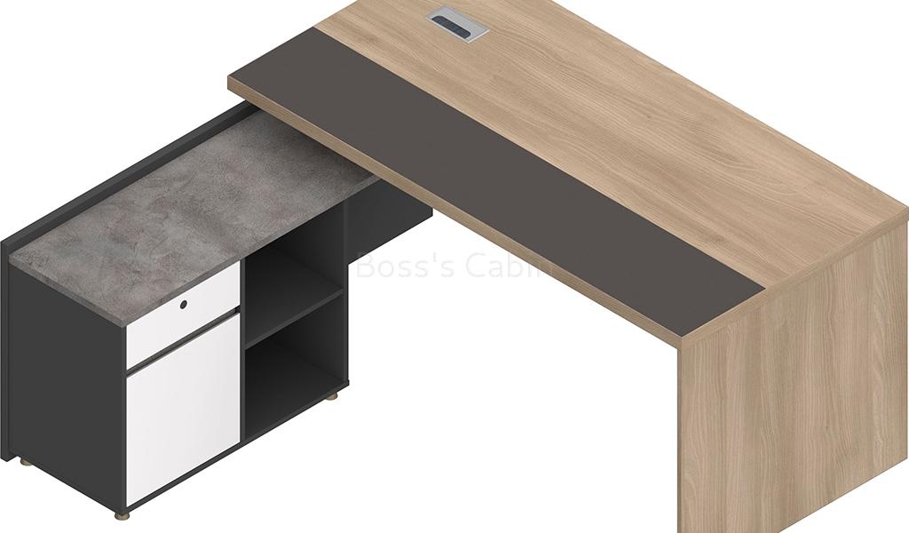 A sleek and compact 5 feet width office table in a stylish blend of Akazie oak, rock grey, and carbon grey laminates. It features a side cabinet with a drawer, closed compartment, and open storage space, along with an aluminum alloy flip-open wirebox on the desktop and integrated cable management. Ideal for cabins of 100 sq. ft. and above, this table pairs seamlessly with all Spiro series products.