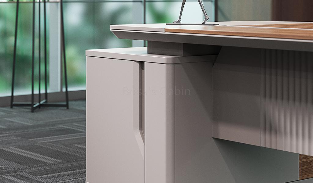 A medium-sized office table in rich sandalwood and seagull gray laminate, featuring a dual-tone top with chamfered edges and rounded corners. Includes a side cabinet with number-lock drawers, shelves, and CPU space. A fluted modesty panel adds style, while an inbuilt wire grommet and concealed power sockets ensure easy connectivity. Part of the Swan series its ideal for cabins of 150 sq. ft. and above.